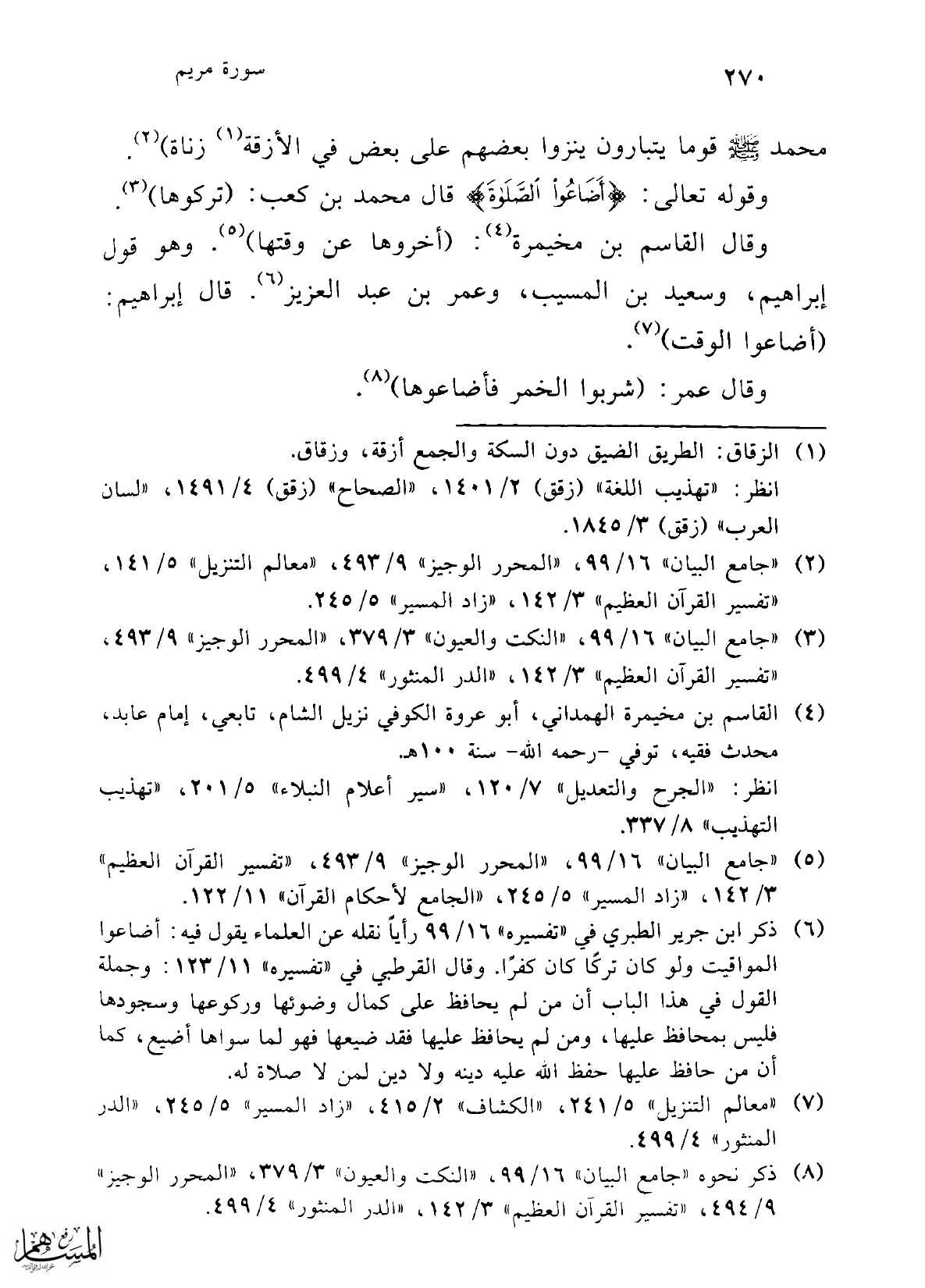 (¬6) ذكر ابن جرير الطبري في "تفسيره" 16/ 99 رأيًا نقله عن العلماء يقول فيه: أضاعوا المواقيت ولو كان تركًا كان كفرًا. وقال القرطبي في "تفسيره" 11/ 123: وجملة القول في هذا الباب أن من لم يحافظ على كمال وضوئها وركوعها وسجودها فليس بمحافظ عليها، ومن لم يحافظ عليها فقد ضيعها فهو لما سواها أضيع، كما أن من حافظ عليها حفظ الله عليه دينه ولا دين لمن لا صلاة له.