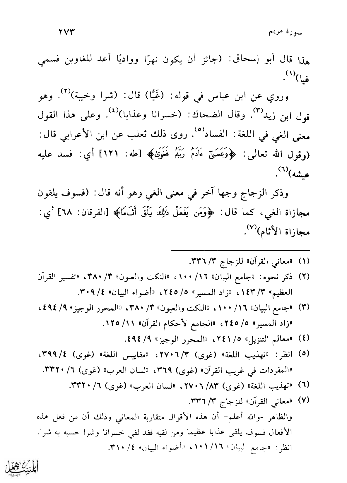 وذكر الزجاج وجها آخر في معنى الغي وهو أنه قال: (فسوف يلقون مجازاة الغي، كما قال: {وَمَنْ يَفْعَلْ ذَلِكَ يَلْقَ أَثَامًا} [الفرقان: 68] أي: مجازاة الأثام) (¬7).