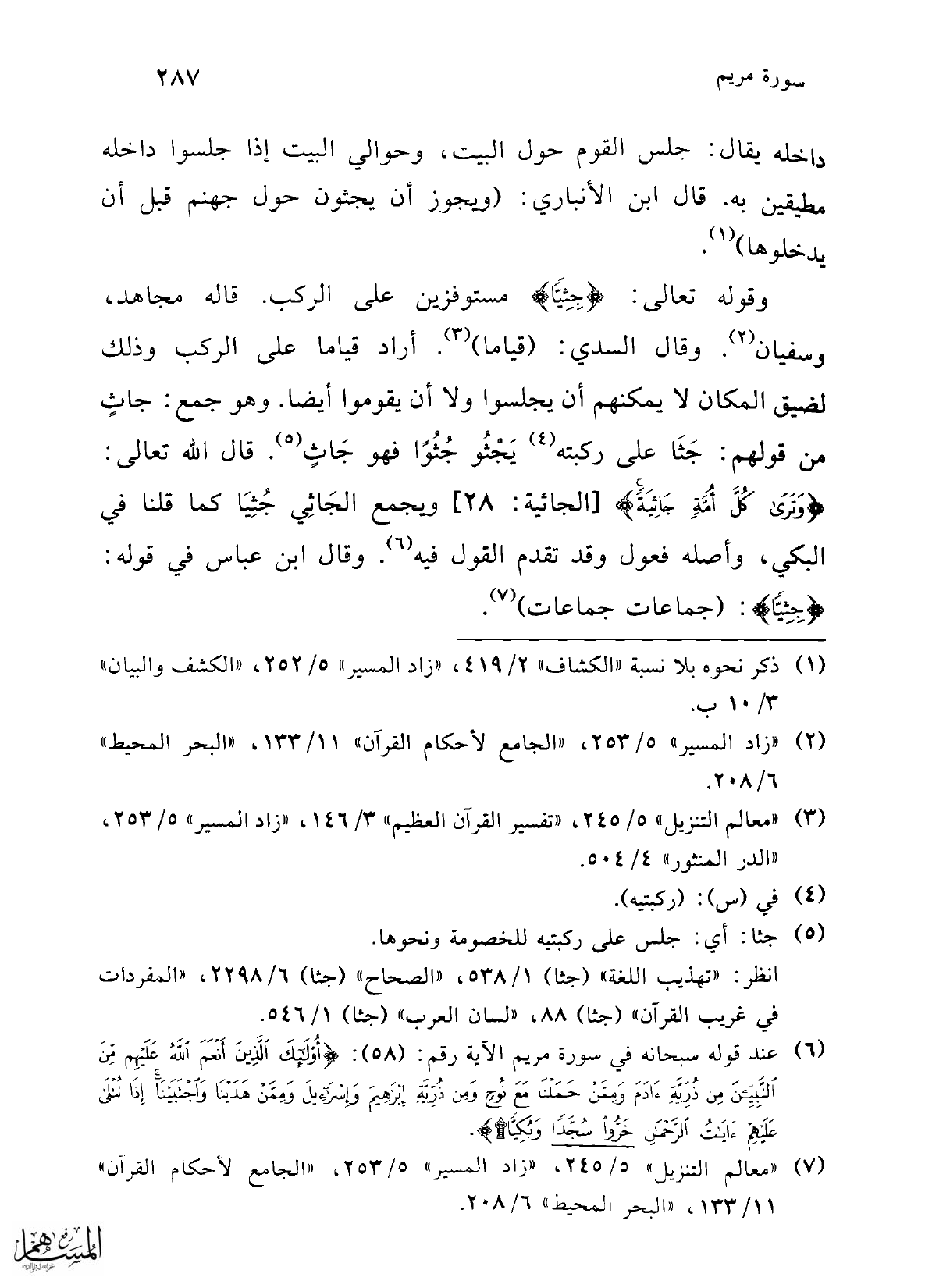 وقوله تعالى: {جِثِيًّا} مستوفزين على الركب. قاله مجاهد، وسفيان (¬2). وقال السدي: (قياما) (¬3). أراد قياما على الركب وذلك لضيق المكان لا يمكنهم أن يجلسوا ولا أن يقوموا أيضا. وهو جمع: جاثٍ من قولهم: جَثَا على ركبته (¬4) يَجْثُو جُثُوًا فهو جَاثٍ (¬5). قال الله تعالى: {وَتَرَى كُلَّ أُمَّةٍ جَاثِيَةً} [الجاثية: 28] ويجمع الجَاثِي جُثِيَا كما قلنا في البكي، وأصله فعول وقد تقدم القول فيه (¬6). وقال ابن عباس في قوله: {جِثِيّا}: (جماعات جماعات) (¬7).