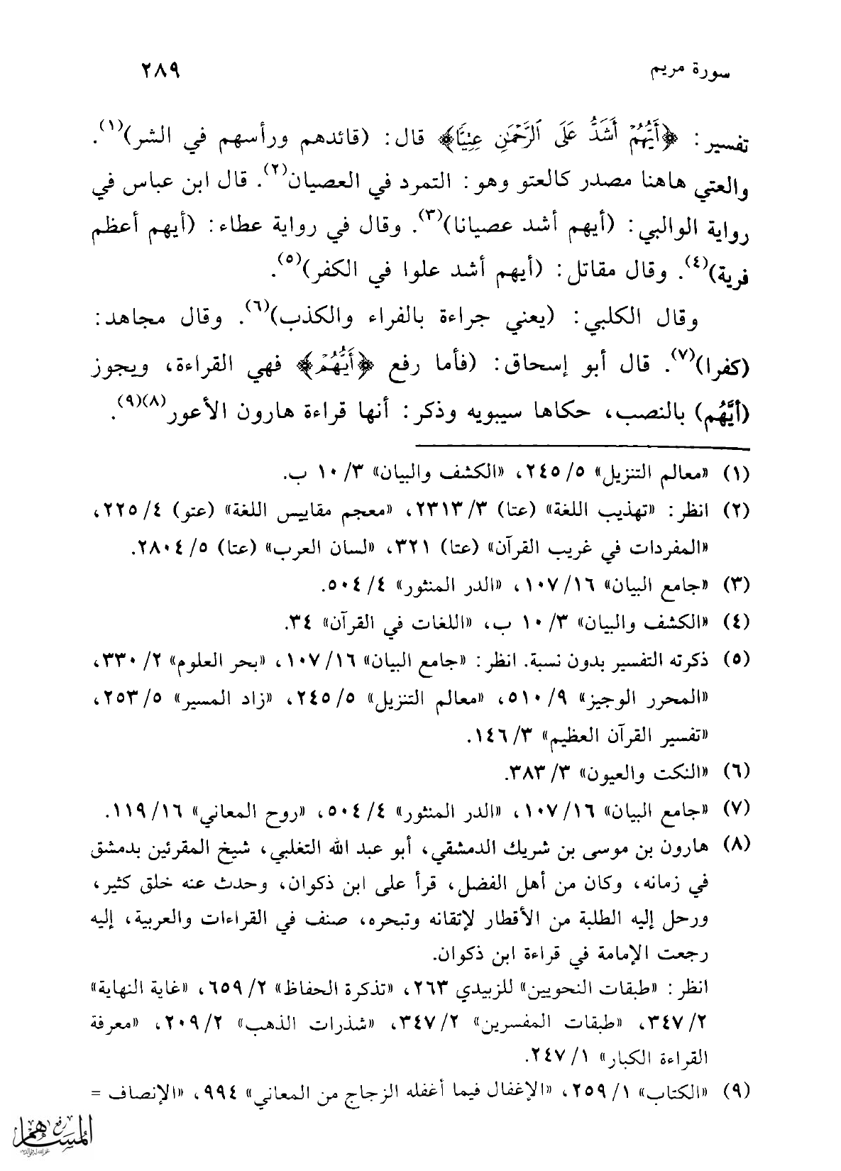 تفسير: {أَيُّهُمْ أَشَدُّ عَلَى الرَّحْمَنِ عِتِيًّا} قال: (قائدهم ورأسهم في الشر) (¬1). والعتي هاهنا مصدر كالعتو وهو: التمرد في العصيان (¬2). قال ابن عباس في رواية الوالبي: (أيهم أشد عصيانا) (¬3). وقال في رواية عطاء: (أيهم أعظم فرية) (¬4). وقال مقاتل: (أيهم أشد علوا في الكفر) (¬5).