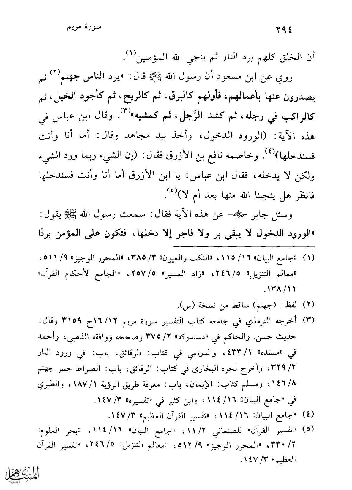 (¬3) أخرجه الترمذي في جامعه كتاب التفسير سورة مريم 12/ 16 ح 3159 وقال: حديث حسن. والحاكم في "مستدركه" 2/ 375 وصححه ووافقه الذهبي، وأحمد في "مسنده" 1/ 433، والدرامي في كتاب: الرقائق، باب: في ورود النار 2/ 329، وأخرج نحوه البخاري في كتاب: الرقائق، باب: الصراط جسر جهنم 8/ 146، ومسلم كتاب: الإيمان، باب: معرفة طريق الرؤية 1/ 187، والطبري في "جامع البيان" 16/ 114، وابن كثير في "تفسيره" 3/ 147.