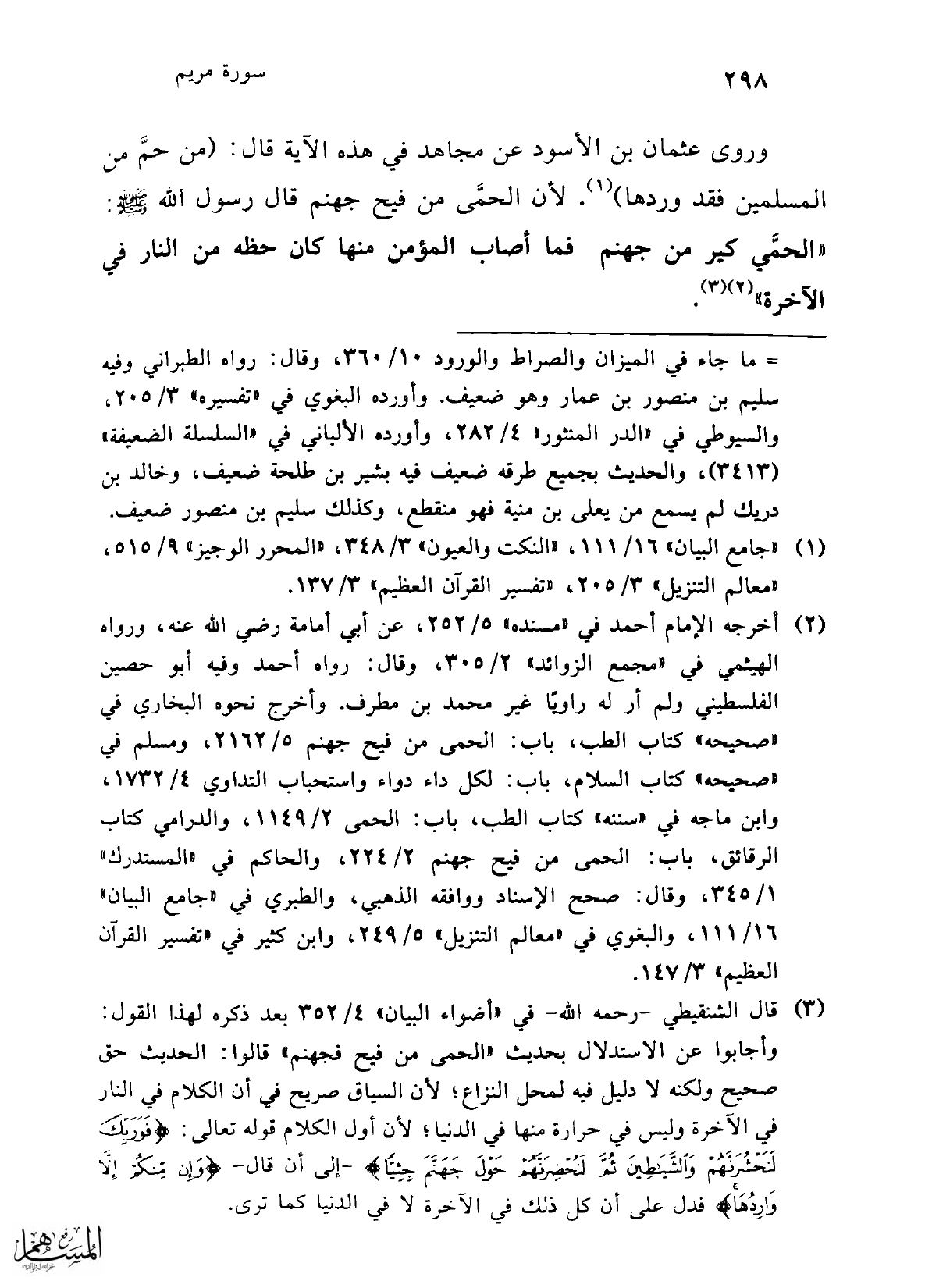 (¬3) قال الشنقيطي -رحمه الله- في "أضواء البيان" 4/ 352 بعد ذكره لهذا القول: وأجابوا عن الاستدلال بحديث "الحمى من فيح فجهنم" قالوا: الحديث حق صحيح ولكنه لا دليل فيه لمحل النزاع؛ لأن السياق صريح في أن الكلام في النار في الآخرة وليس في حرارة منها في الدنيا؛ لأن أول الكلام قوله تعالى: {فَوَرَبِّكَ لَنَحْشُرَنَّهُمْ وَالشَّيَاطِينَ ثُمَّ لَنُحْضِرَنَّهُمْ حَوْلَ جَهَنَّمَ جِثِيًّا} -إلى أن قال- {وَإِنْ مِنْكُمْ إِلَّا وَارِدُهَا} فدل على أن كل ذلك في الآخرة لا في الدنيا كما ترى.