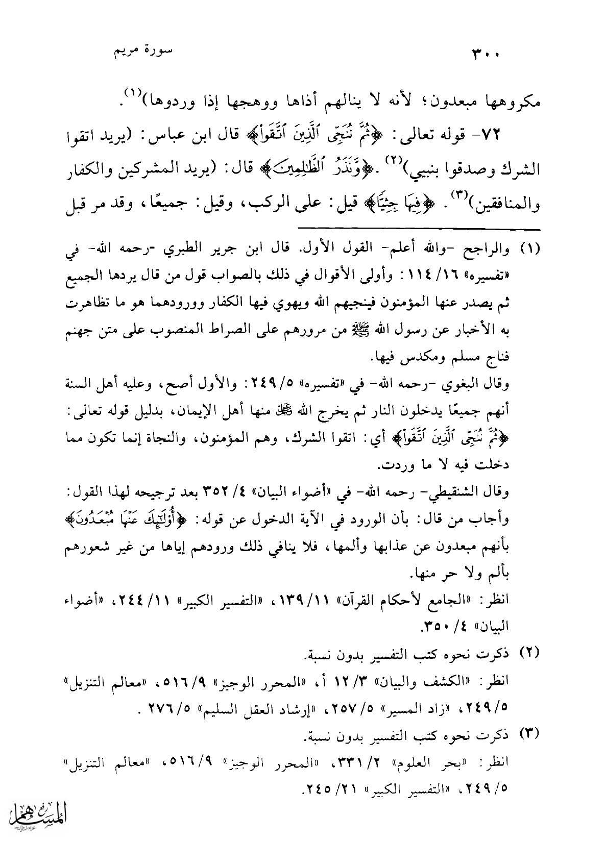 (¬1) والراجح -والله أعلم- القول الأول. قال ابن جرير الطبري -رحمه الله- في "تفسيره" 16/ 114: وأولى الأقوال في ذلك بالصواب قول من قال يردها الجميع ثم يصدر عنها المؤمنون فينجيهم الله ويهوي فيها الكفار وورودهما هو ما تظاهرت به الأخبار عن رسول الله -صلى الله عليه وسلم- من مرورهم على الصراط المنصوب على متن جهنم فناج مسلم ومكدس فيها.