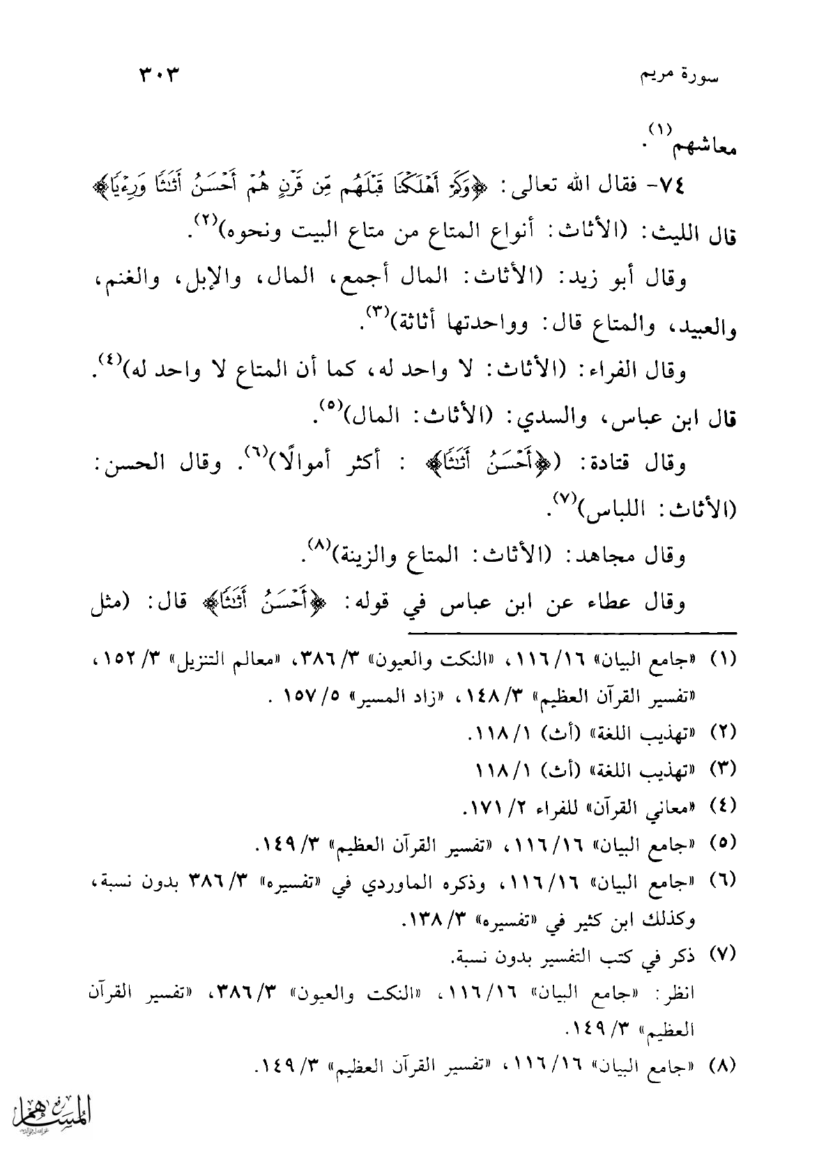 74 - فقال الله تعالى: {وَكَمْ أَهْلَكْنَا قَبْلَهُمْ مِنْ قَرْنٍ هُمْ أَحْسَنُ أَثَاثًا وَرِئْيًا} قال الليث: (الأثاث: أنواع المتاع من متاع البيت ونحوه) (¬2).