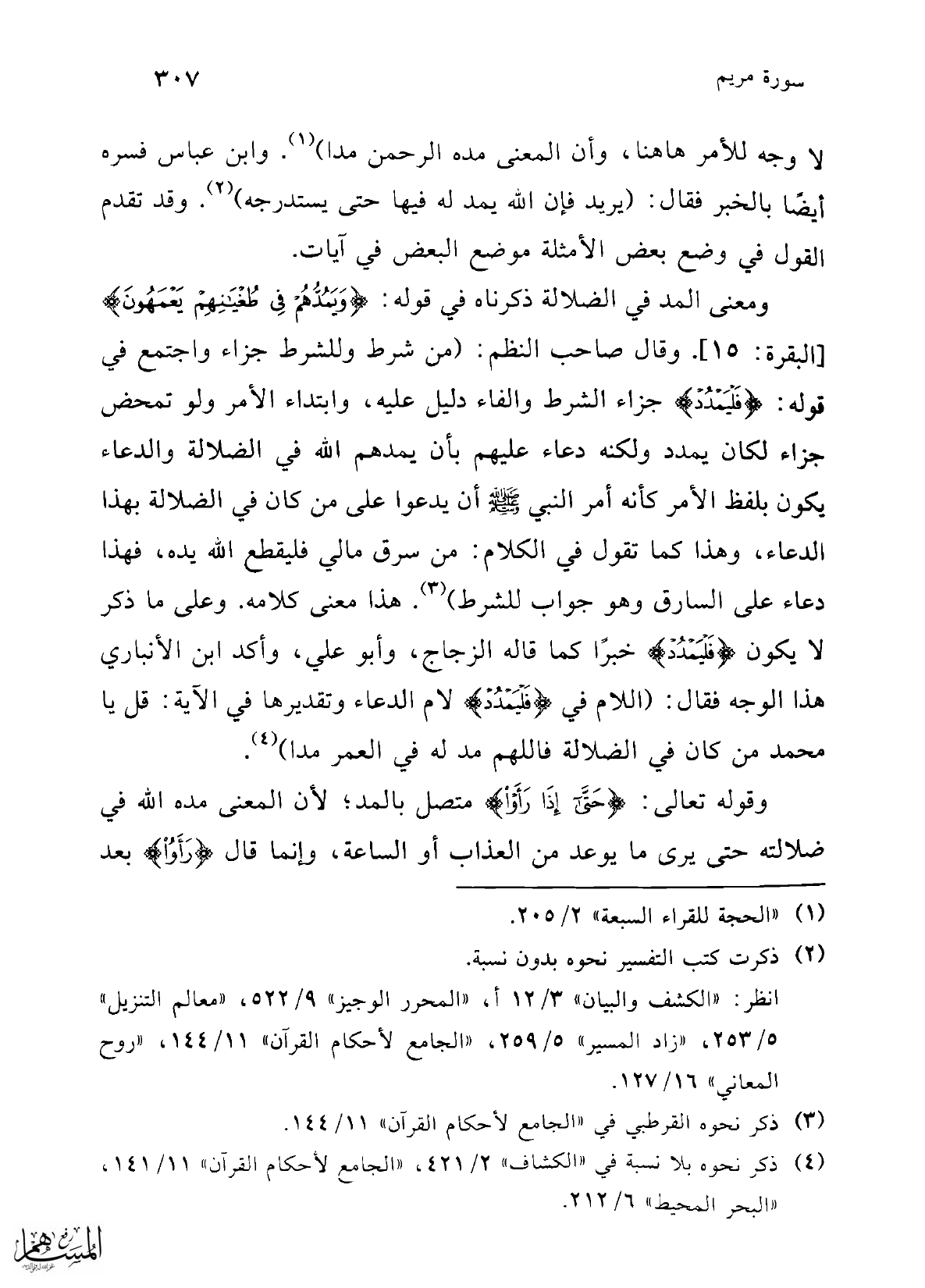 ومعنى المد في الضلالة ذكرناه في قوله: {وَيَمُدُّهُمْ في طُغْيَانِهِمْ يَعْمَهُونَ} [البقرة: 15]. وقال صاحب النظم: (من شرط وللشرط جزاء واجتمع في قوله: {فَلْيَمْدُدْ} جزاء الشرط والفاء دليل عليه، وابتداء الأمر ولو تمحض جزاء لكان يمدد ولكنه دعاء عليهم بأن يمدهم الله في الضلالة والدعاء يكون بلفظ الأمر كأنه أمر النبي -صلى الله عليه وسلم- أن يدعوا على من كان في الضلالة بهذا الدعاء، وهذا كما تقول في الكلام: من سرق مالي فليقطع الله يده، فهذا دعاء على السارق وهو جواب للشرط) (¬3). هذا معنى كلامه. وعلى ما ذكر لا يكون {فَلْيَمْدُدْ} خبرًا كما قاله الزجاج، وأبو علي، وأكد ابن الأنباري هذا الوجه فقال: (اللام في {فَلْيَمْدُدْ} لام الدعاء وتقديرها في الآية: قل يا محمد من كان في الضلالة فاللهم مد له في العمر مدا) (¬4).
