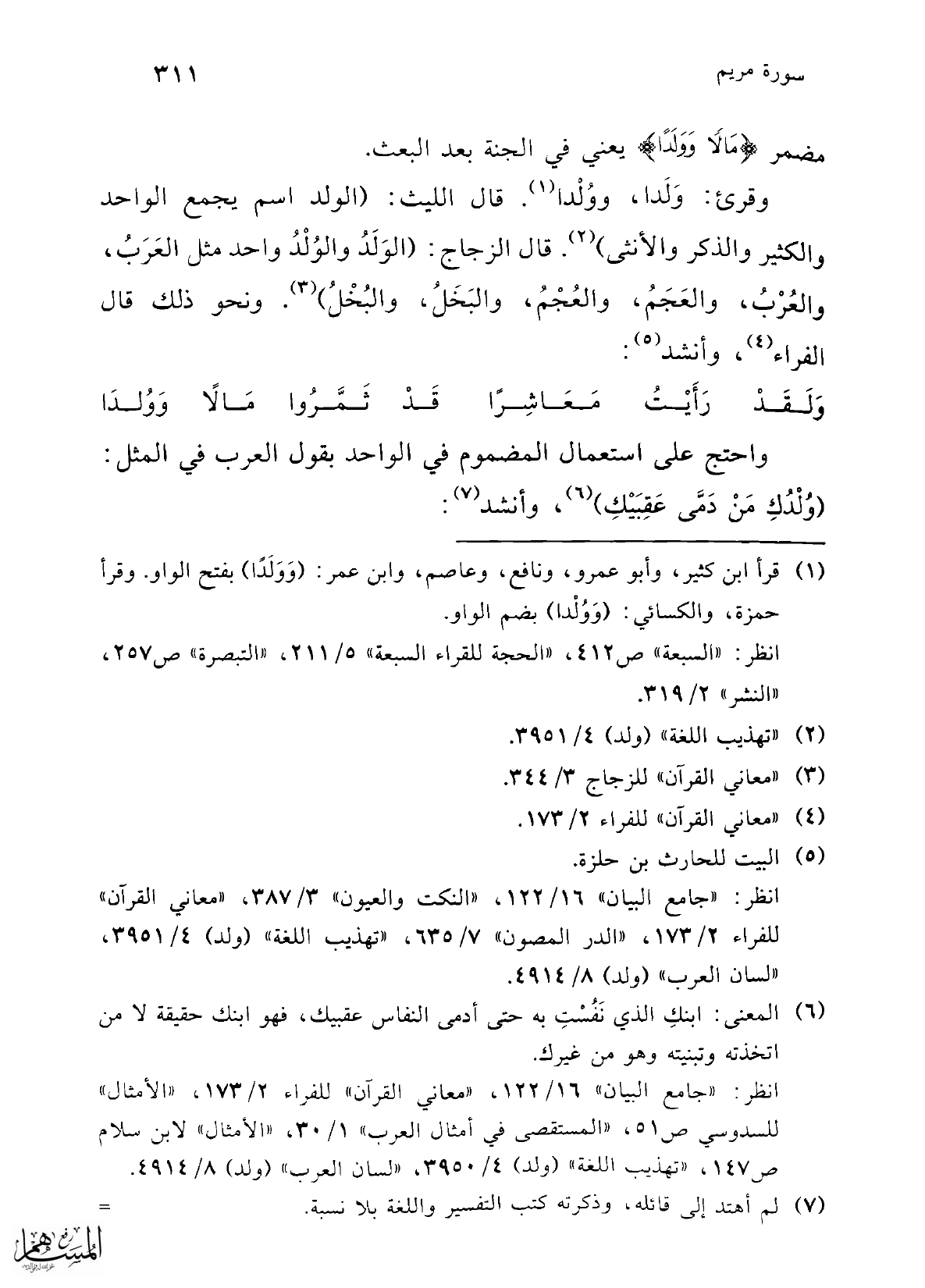 (¬1) قرأ ابن كثير، وأبو عمرو، ونافع، وعاصم، وابن عمر: (وَوَلَدًا) بفتح الواو. وقرأ حمزة، والكسائي: (وَوُلْدا) بضم الواو.