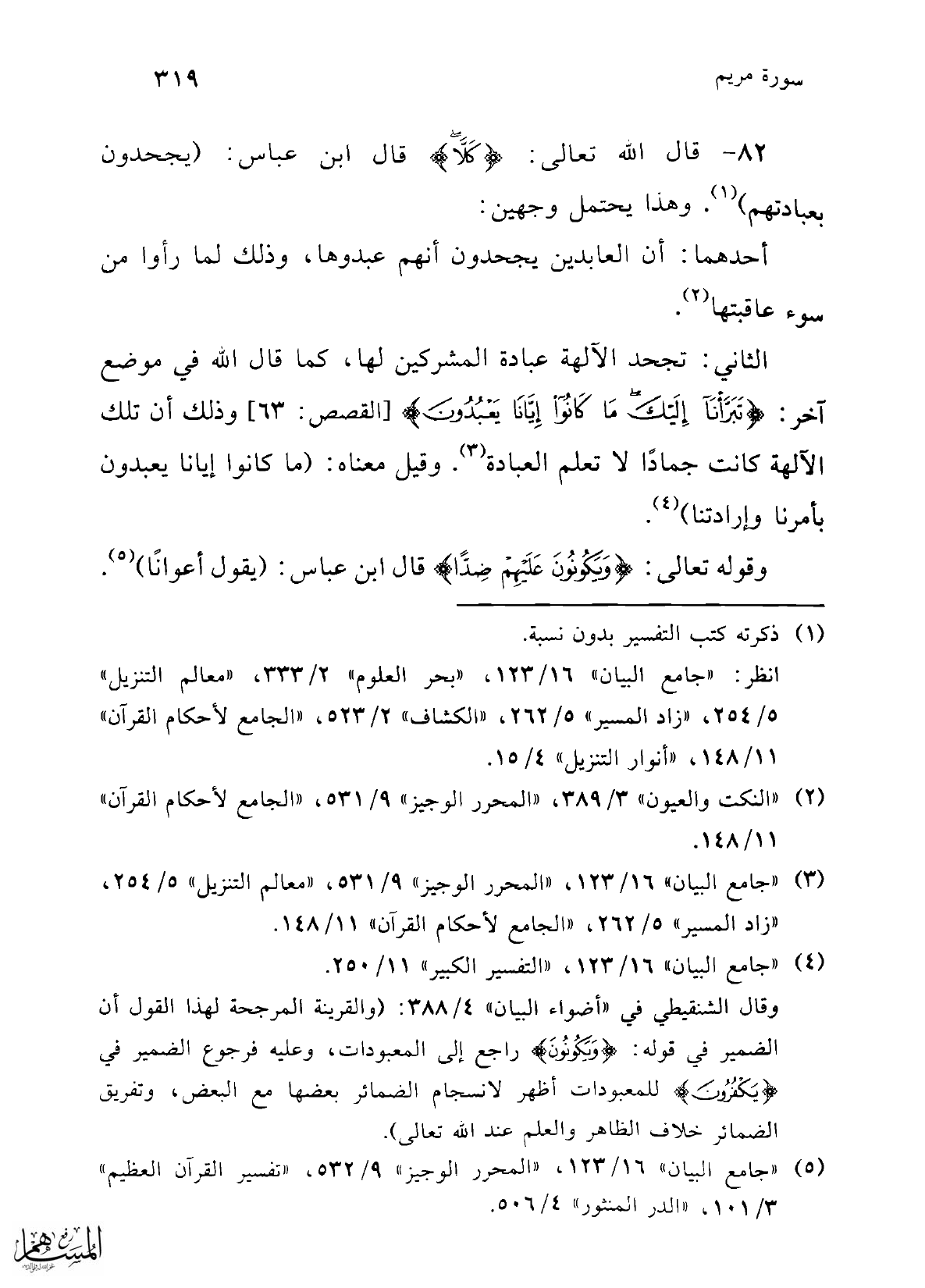 وقال الشنقيطي في "أضواء البيان" 4/ 388: (والقرينة المرجحة لهذا القول أن الضمير في قوله: {وَيَكُونُونَ} راجع إلى المعبودات، وعليه فرجوع الضمير في {يَكْفُرُونَ} للمعبودات أظهر لانسجام الضمائر بعضها مع البعض، وتفريق الضمائر خلاف الظاهر والعلم عند الله تعالى).