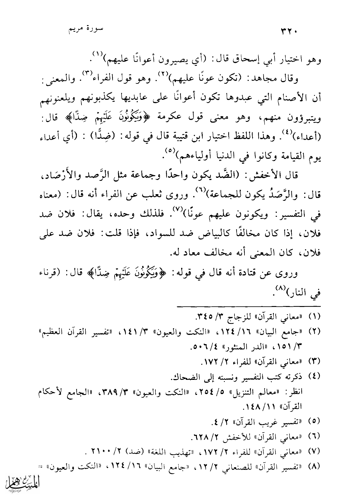 وقال مجاهد: (تكون عونًا عليهم) (¬2). وهو قول الفراء (¬3). والمعنى: أن الأصنام التي عبدوها تكون أعوانًا على عابديها يكذبونهم ويلعنونهم ويتبرؤون منهم، وهو معنى قول عكرمة {وَيَكُونُونَ عَلَيْهِمْ ضِدًّا} قال: (أعداء) (¬4). وهذا اللفظ اختيار ابن قتيبة قال في قوله: (ضِدًّا): (أي أعداء يوم القيامة وكانوا في الدنيا أولياءهم) (¬5).