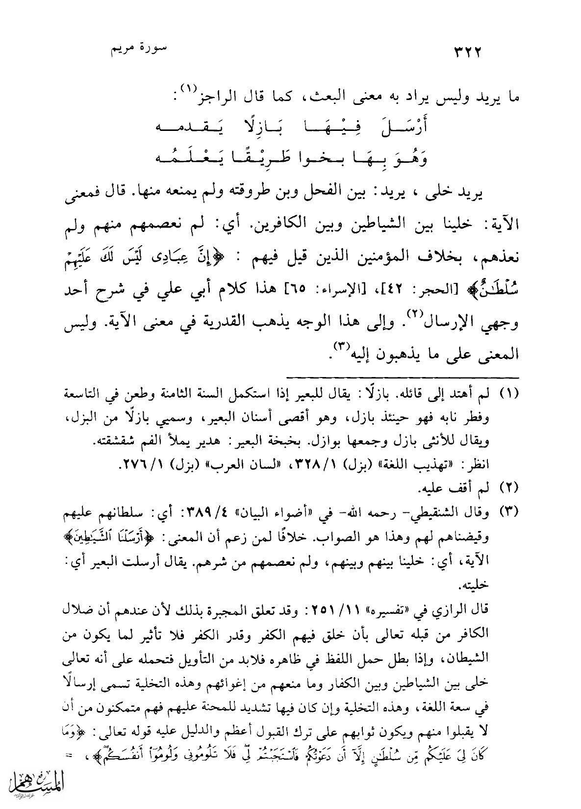 (¬3) وقال الشنقيطي -رحمه الله- في "أضواء البيان" 4/ 389: أي: سلطانهم عليهم وقيضناهم لهم وهذا هو الصواب. خلافًا لمن زعم أن المعنى: {أَرْسَلْنَا الشَّيَاطِينَ} الآية، أي: خلينا بينهم وبينهم، ولم نعصمهم من شرهم. يقال أرسلت البعير أي: خليته.