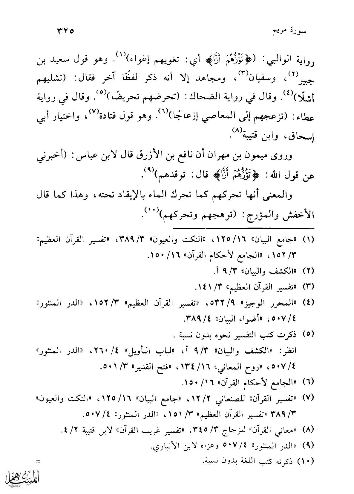 وروى ميمون بن مهران أن نافع بن الأزرق قال لابن عباس: (أخبرني عن قول الله: {تَؤُزُّهُمْ أَزًّا} قال: توقدهم) (¬9).