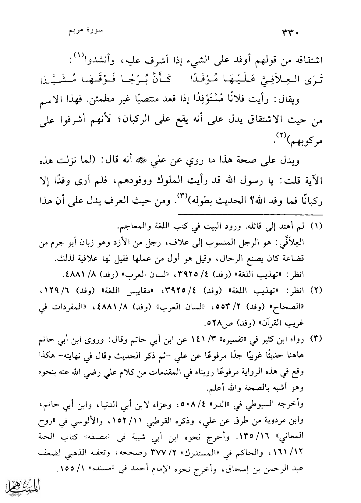 ويدل على صحة هذا ما روي عن علي -رضي الله عنه- أنه قال: (لما نزلت هذه الآية قلت: يا رسول الله قد رأيت الملوك ووفودهم، فلم أرى وفدًا إلا ركبانًا فما وفد الله؟ الحديث بطوله) (¬3). ومن حيث العرف يدل على أن هذا