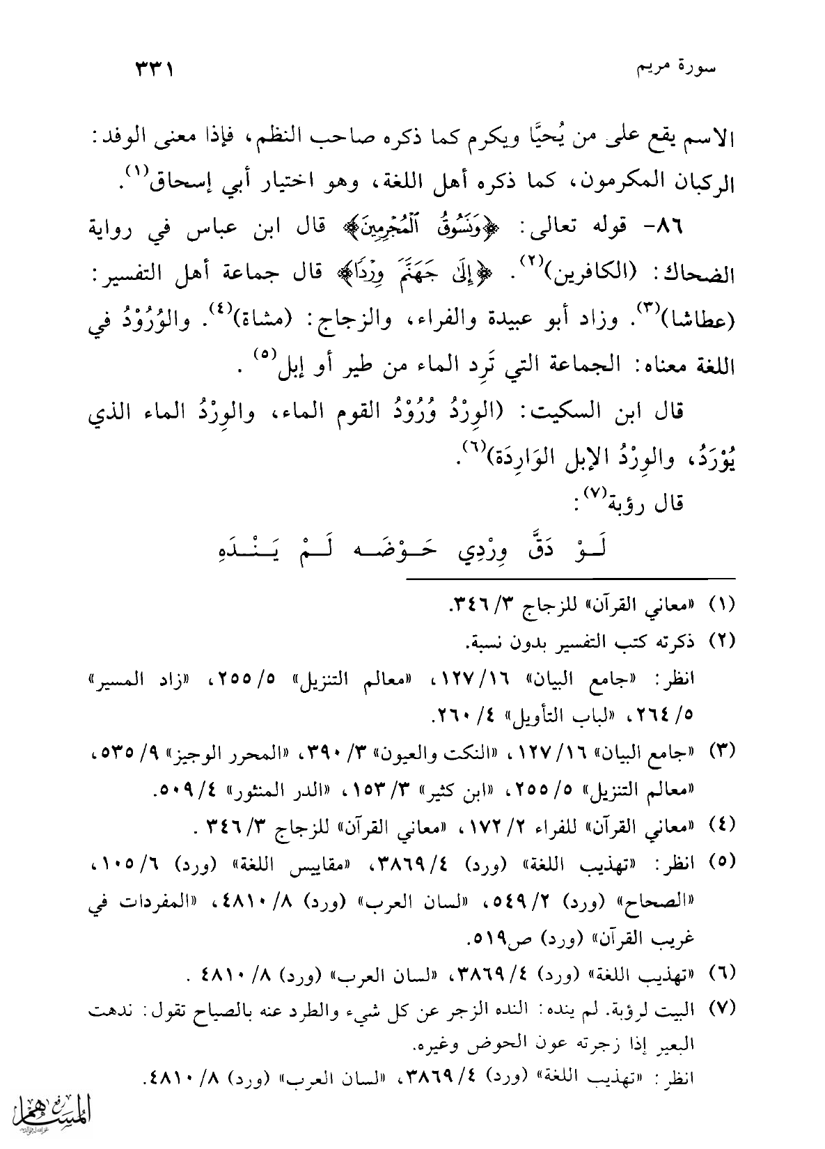 86 - قوله تعالى: {وَنَسُوقُ الْمُجْرِمِينَ} قال ابن عباس في رواية الضحاك: (الكافرين) (¬2) {إِلَى جَهَنَّمَ وِرْدًا} قال جماعة أهل التفسير: (عطاشا) (¬3). وزاد أبو عبيدة والفراء، والزجاج: (مشاة) (¬4). والوُرُوْدُ في اللغة معناه: الجماعة التي تَرِد الماء من طير أو إبل (¬5).