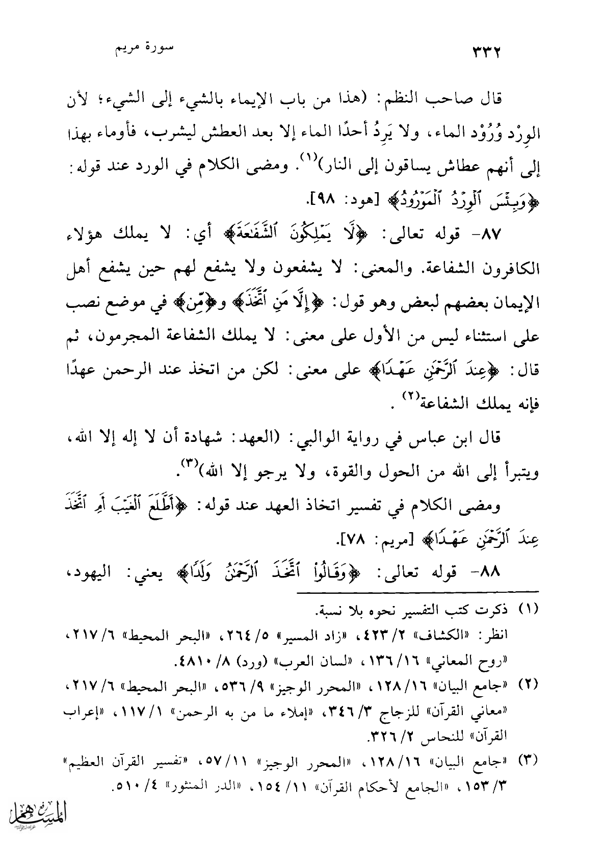 87 - قوله تعالى: {لَا يَمْلِكُونَ الشَّفَاعَة} أي: لا يملك هؤلاء الكافرون الشفاعة. والمعنى: لا يشفعون ولا يشفع لهم حين يشفع أهل الإيمان بعضهم لبعض وهو قول: {إِلَّا مَنِ اتَّخَذَ} و {مِّن} في موضع نصب على استثناء ليس من الأول على معنى: لا يملك الشفاعة المجرمون، ثم قال: {عِنْدَ الرَّحْمَنِ عَهْدًا} على معنى: لكن من اتخذ عند الرحمن عهدًا فإنه يملك الشفاعة (¬2).