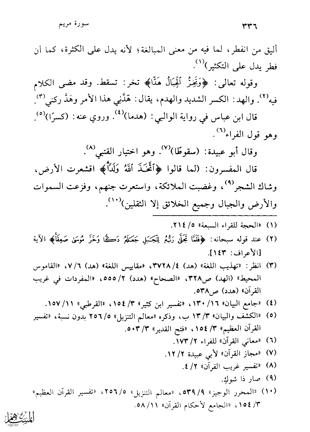 وقوله تعالى: {وَتَخِرُّ الْجِبَالُ هَدًّا} تخر: تسقط. وقد مضى الكلام فيه (¬2). والهد: الكسر الشديد والهدم، يقال: هّدَّنِي هذا الأمر وهَدّ ركني (¬3).
