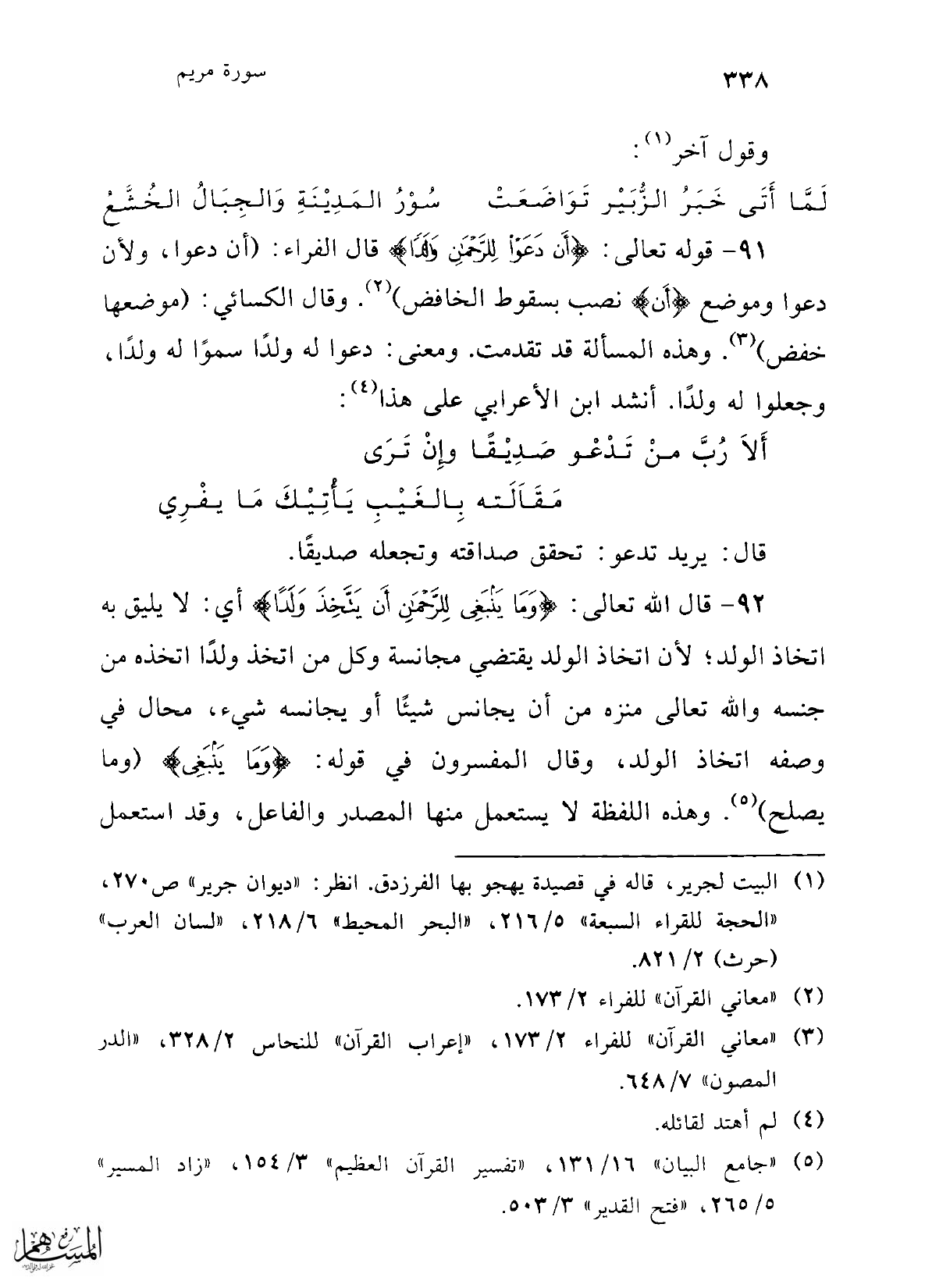 91 - قوله تعالى: {أَنْ دَعَوْا لِلرَّحْمَنِ وَلَدًا} قال الفراء: (أن دعوا، ولأن دعوا وموضع {أَن} نصب بسقوط الخافض) (¬2). وقال الكسائي: (موضعها خفض) (¬3). وهذه المسألة قد تقدمت. ومعنى: دعوا له ولدًا سموًا له ولدًا، وجعلوا له ولدًا. أنشد ابن الأعرابي على هذا (¬4):