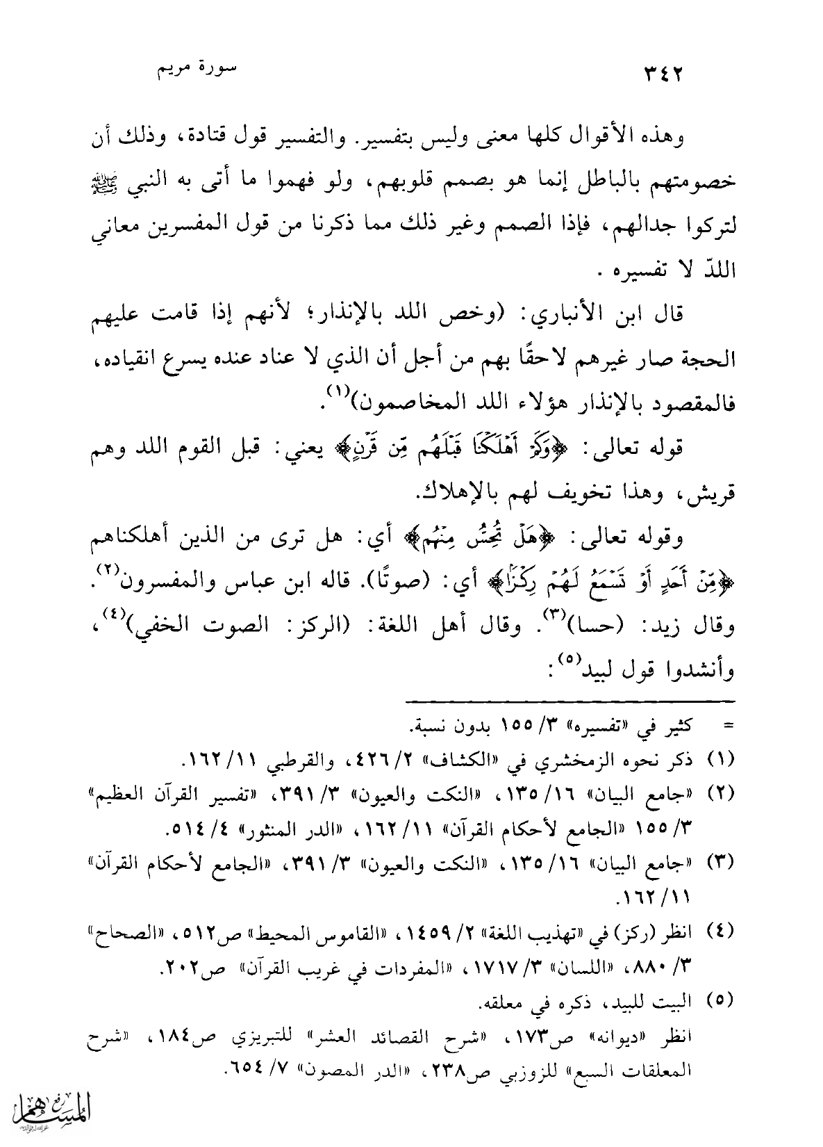 وقوله تعالى: {هَلْ تُحِسُّ مِنْهُم} أي: هل ترى من الذين أهلكناهم {مِنْ أَحَدٍ أَوْ تَسْمَعُ لَهُمْ رِكْزًا} أي: (صوتًا). قاله ابن عباس والمفسرون (¬2). وقال زيد: (حسا) (¬3). وقال أهل اللغة: (الركز: الصوت الخفي) (¬4)، وأنشدوا قول لبيد (¬5):