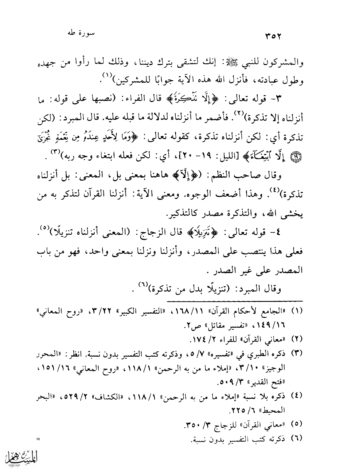 3 - قوله تعالى: {إِلَّا تَذْكِرَةً} قال الفراء: (نصبها على قوله: ما أنزلناه إلا تذكرة) (¬2). فأضمر ما أنزلناه لدلالة ما قبله عليه. قال المبرد: (لكن تذكرة أي: لكن أنزلناه تذكرة، كقوله تعالى: {وَمَا لِأَحَدٍ عِنْدَهُ مِنْ نِعْمَةٍ تُجْزَى (19) إِلَّا ابْتِغَاءَ} [الليل:19 - 20]، أي: لكن فعله ابتغاء وجه ربه) (¬3).
