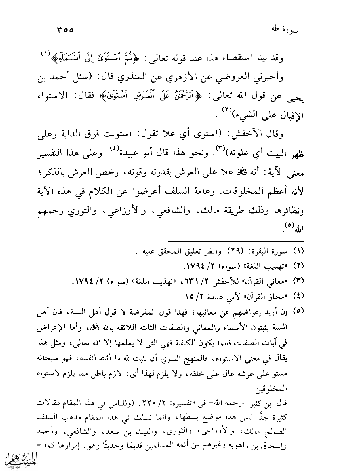 (¬5) إن أريد إعراضهم عن معانيها؛ فهذا قول المفوضة لا قول أهل السنة، فإن أهل السنة يثبتون الأسماء والمعاني والصفات الثابتة اللائقة بالله عز وجل، وأما الإعراض في آيات الصفات فإنما يكون للكيفية فهي التي لا يعلمها إلا الله تعالى، ومثل هذا يقال في معنى الاستواء، فالمنهج السوي أن نثبت لله ما أثبته لنفسه، فهو سبحانه مستو على عرشه عال على خلقه، ولا يلزم لهذا أي: لازم باطل مما يلزم لاستواء المخلوقين.