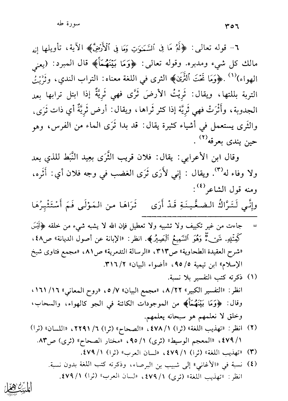 6 - قوله تعالى: {لَهُ مَا فِي السَّمَاوَاتِ وَمَا فِي الْأَرْضِ} الآية، تأويلها إنه مالك كل شيء ومدبره. وقوله تعالى: {وَمَا بَيْنَهُمَا} قال المبرد: (يعني الهواء) (¬1). {وَمَا تَحْتَ الثَّرَى} الثرى في اللغة معناه: التراب الندي، وثَرَّيْتُ التربة بللتها، ويقال: ثَرِيْتُ الأرضَ ثَرَّى فهي ثَرِيَّةٌ إذا ابتل ترابها بعد الجدوبة، وأَثْرَتْ فهي ثَرِيَّة إذا كثر ثَراها، ويقال: أرض ثَرِيَّةٌ أي ذات ثَرَى، والثَرى يستعمل في أشياء كثيرة يقال: قد بدا ثَرَى الماء من الفرس، وهو حين يندى بعرقه (¬2).