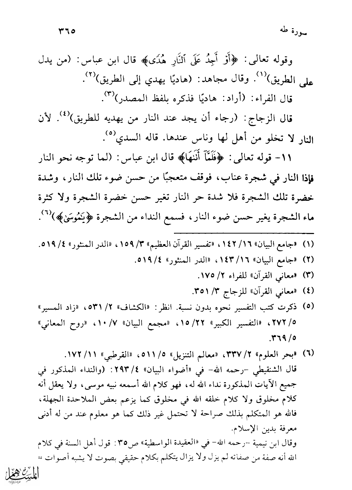 قال الشنقيطي -رحمه الله- في "أضواء البيان" 4/ 293: (والنداء المذكور في جمغ الآيات المذكورة نداء الله له، فهو كلام الله أسمعه نبيه موسى، ولا يعقل أنه كلام مخلوق ولا كلام خلقه الله في مخلوق كما يزعم بعض الملاحدة الجهلة، فالله هو المتكلم بذلك صراحة لا تحتمل غير ذلك كما هو معلوم عند من له أدنى معرفة بدين الإسلام.