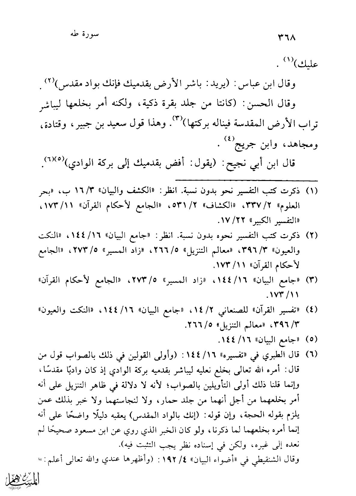 (¬6) قال الطبري في "تفسيره" 16/ 144: (وأولى القولين في ذلك بالصواب قول من قال: أمره الله تعالى بخلع نعليه ليباشر بقدميه بركة الوادي إذ كان واديًا مقدسًا، وإنما قلنا ذلك أولى التأويلين بالصواب؛ لأنه لا دلالة في ظاهر التنزيل على أنه أمر بخلعهما من أجل أنهما من جلد حمار، ولا لنجاستهما ولا خبر بذلك عمن يلزم بقوله الحجة، وإن قوله: (إنك بالواد المقدس) يعقبه دليلًا واضحًا على أنه إنما أمره بخلعهما لما ذكرنا, ولو كان الخبر الذي روي عن ابن مسعود صحيحًا لم نعده إلى غيره، ولكن في إسناده نظر يجب التثبت فيه).
