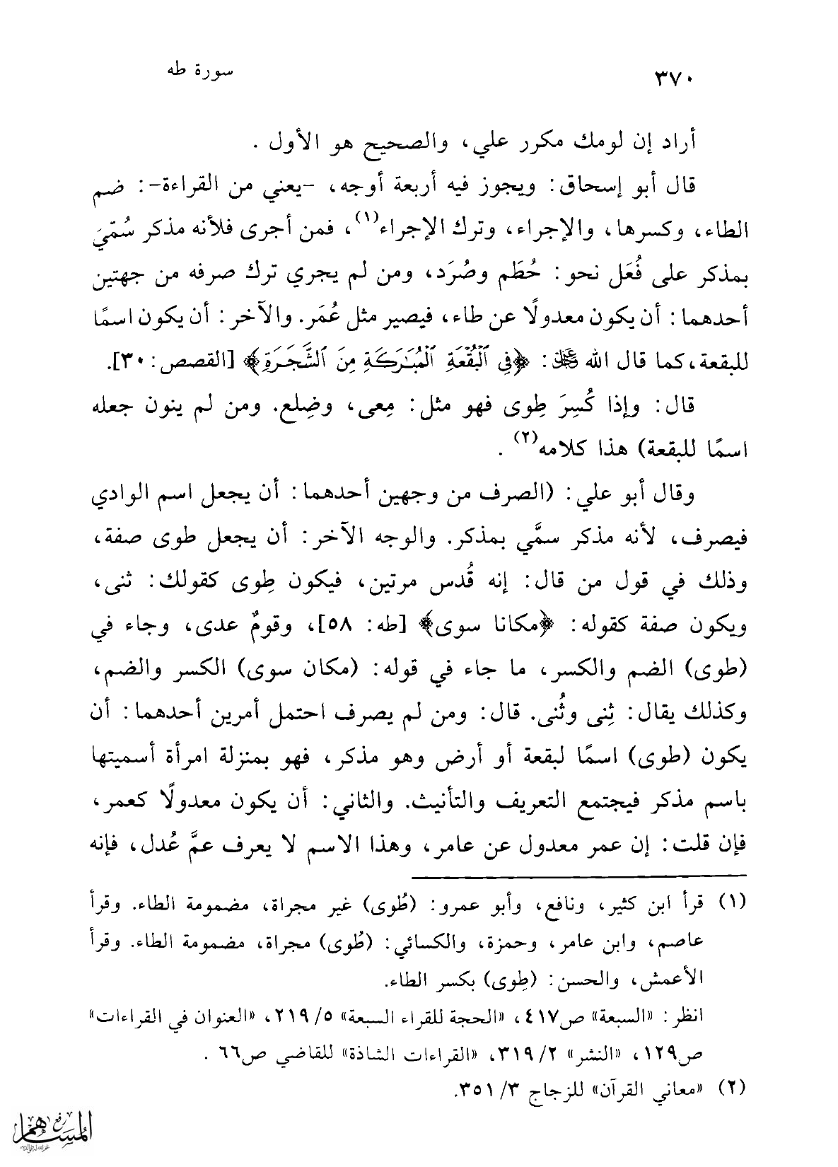 وقال أبو علي: (الصرف من وجهين أحدهما: أن يجعل اسم الوادي فيصرف؛ لأنه مذكر سمَّي بمذكر. والوجه الآخر: أن يجعل طوى صفة، وذلك في قول من قال: إنه قُدس مرتين، فيكون طِوى كقولك: ثنى، ويكون صفة كقوله: {مَكَانًا سُوًى} [طه:58]، وقومٌ على، وجاء في (طوى) الضم والكسر، ما جاء في قوله: (مكان سوى) الكسر والضم، وكذلك يقال: ثِنى وثُنى. قال: ومن لم يصرف احتمل أمرين أحدهما: أن يكون (طوى) اسمًا لبقعة أو أرض وهو مذكر، فهو بمنزلة امرأة أسميتها باسم مذكر فيجتمع التعريف والتأنيث. والثاني: أن يكون معدولًا كعمر، فإن قلت: إن عمر معدول عن عامر، وهذا الاسم لا يعرف عمَّ عُدل، فإنه