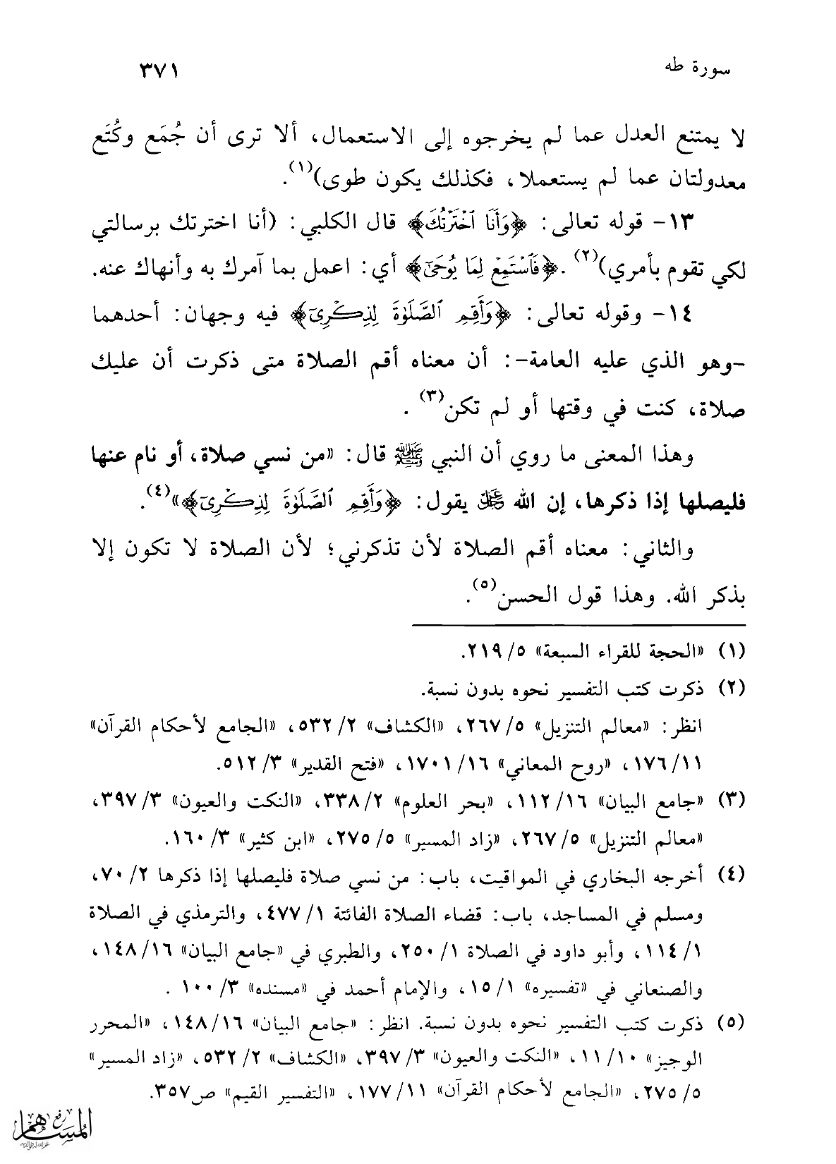 (¬4) أخرجه البخاري في المواقيت، باب: من نسي صلاة فليصلها إذا ذكرها 2/ 70، ومسلم في المساجد، باب: قضاء الصلاة الفائتة 1/ 477، والترمذي في الصلاة 1/ 114، وأبو داود في الصلاة 1/ 250، والطبري في "جامع البيان" 16/ 148، والصنعاني في "تفسيره" 1/ 15، والإمام أحمد في "مسنده" 3/ 100.