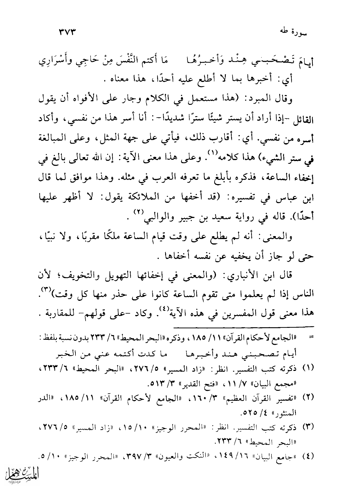 وقال المبرد: (هذا مستعمل في الكلام وجار على الأفواه أن يقول القائل -إذا أراد أن يستر شيئًا سترًا شديدًا-: أنا أسر هذا من نفسي، وأكاد أسره من نفسي. أي: أقارب ذلك، فيأتي على جهة المثل، وعلى المبالغة في ستر الشيء) هذا كلامه (¬1). وعلى هذا معنى الآية: إن الله تعالى بالغ في إخفاء الساعة، فذكره بأبلغ ما تعرفه العرب في مثله. وهذا موافق لما قال ابن عباس في تفسيره: (قد أخفها من الملائكة يقول: لا أظهر عليها أحداً). قاله في رواية سعيد بن جبير والوالبي (¬2).