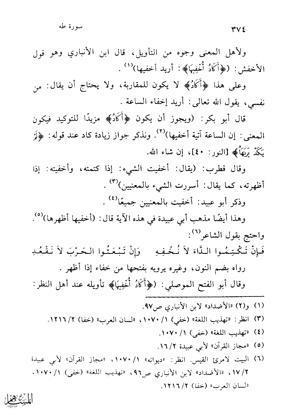 ولأهل المعنى وجوه من التأويل، قال ابن الأنباري وهو قول الأخفش: ({أَكَادُ أُخْفِيهَا}: أريد أخفيها) (1).