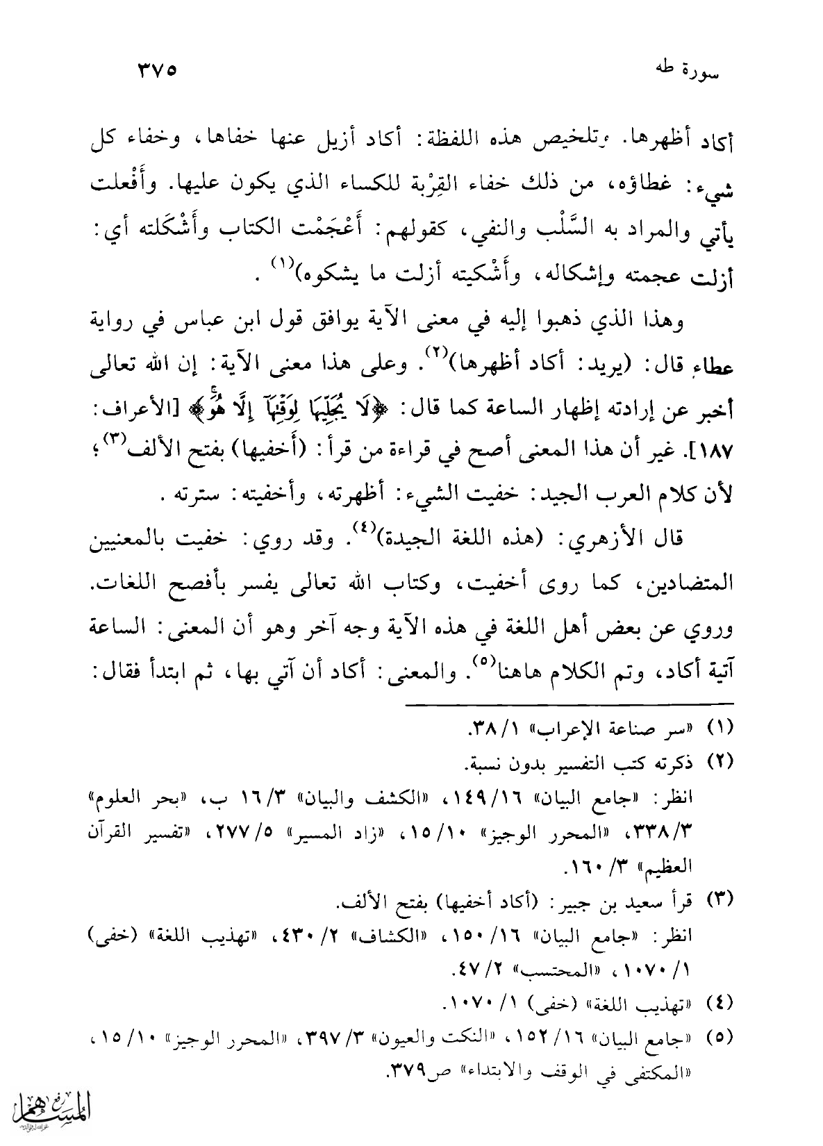 (¬3) قرأ سعيد بن جبير: (أكاد أخفيها) بفتح الألف.