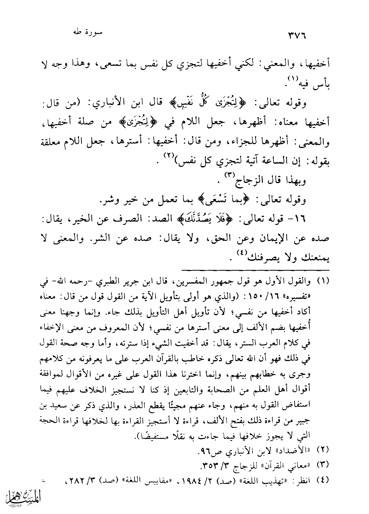 (¬1) والقول الأول هو قول جمهور المفسرين، قال ابن جرير الطبري -رحمه الله- في "تفسيره" 16/ 150: (والذي هو أولى بتأويل الآية من القول قول من قال: معناه أكاد أخفيها من نفسي؛ لأن تأويل أهل التأويل بذلك جاء. وإنما وجهنا معنى أُخفيها بضم الألف إلى معنى أسترها من نفسي؛ لأن المعروف من معنى الإخفاء في كلام العرب الستر، يقال: قد أخفيت الشيء إذا سترته، وأما وجه صحة القول في ذلك فهو أن الله تعالى ذكره خاطب بالقرآن العرب على ما يعرفونه من كلامهم وجرى به خطابهم بينهم، وإنما اخترنا هذا القول على غيره من الأقوال لموافقة أقوال أهل العلم من الصحابة والتابعين إذ كنا لا نستجيز الخلاف عليهم فيما استفاض القول به منهم، وجاء عنهم مجيئًا يقطع العذر، والذي ذكر عن سعيد بن جبير من قراءة ذلك بفتح الألف، قراءة لا أستجيز القراءة بها لخلافها قراءة الحجة التي لا يجوز خلافها فيما جاءت به نقلاً مستفيضًا).