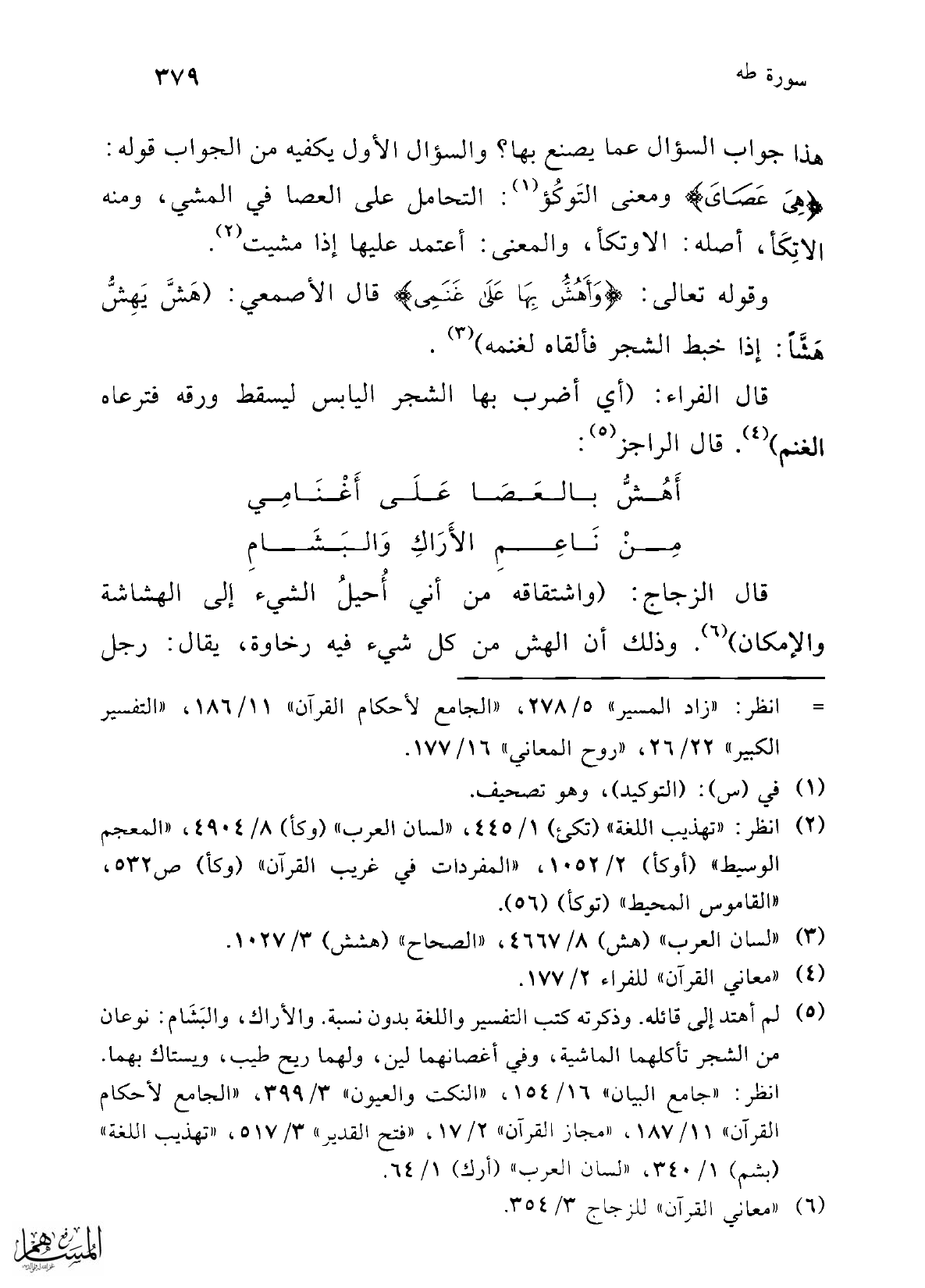 وقوله تعالى: {وَأَهُشُّ بِهَا عَلَى غَنَمِي} قال الأصمعي: (هَشَّ يَهِشُّ هَشَّاً: إذا خبط الشجر فألقاه لغنمه) (¬3).