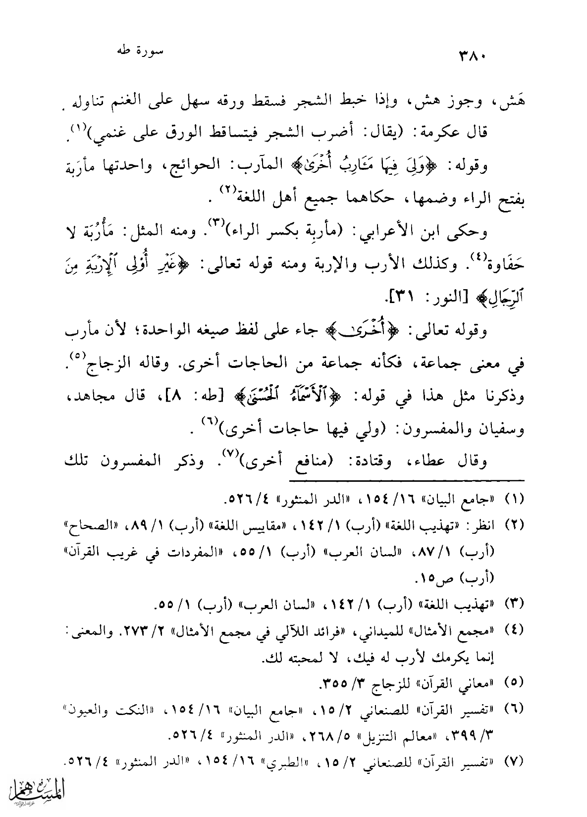وقوله: {وَلِيَ فِيهَا مَآرِبُ أُخْرَى} المآرب: الحوائج، واحدتها مأرَبة بفتح الراء وضمها، حكاهما جميع أهل اللغة (¬2).