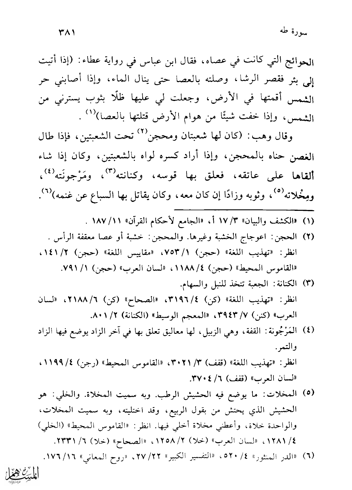 الحوائج التي كانت في عصاه، فقال ابن عباس في رواية عطاء: (إذا أتيت إلى بئر فقصر الرشا، وصلته بالعصا حتى ينال الماء، وإذا أصابني حر الشمس أقمتها في الأرض، وجعلت لي عليها ظلاً بثوب يسترني من الشمس، وإذا خفت شيئًا من هوام الأرض قتلتها بالعصا) (¬1).