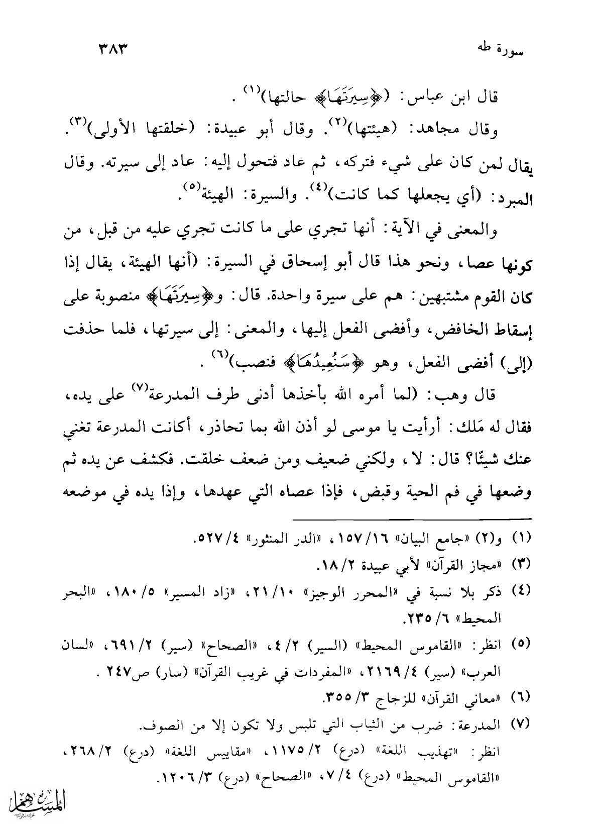 والمعنى في الآية: أنها تجري على ما كانت تجري عليه من قبل، من كونها عصا، ونحو هذا قال أبو إسحاق في السيرة: (أنها الهيئة، يقال إذا كان القوم مشتبهين: هم على سيرة واحدة. قال: و {سِيرَتَهَا} منصوبة على إسقاط الخافض، وأفضى الفعل إليها، والمعنى: إلى سيرتها، فلما حذفت (إلى) أفضى الفعل، وهو {سَنُعِيدُهَا} فنصب) (6).