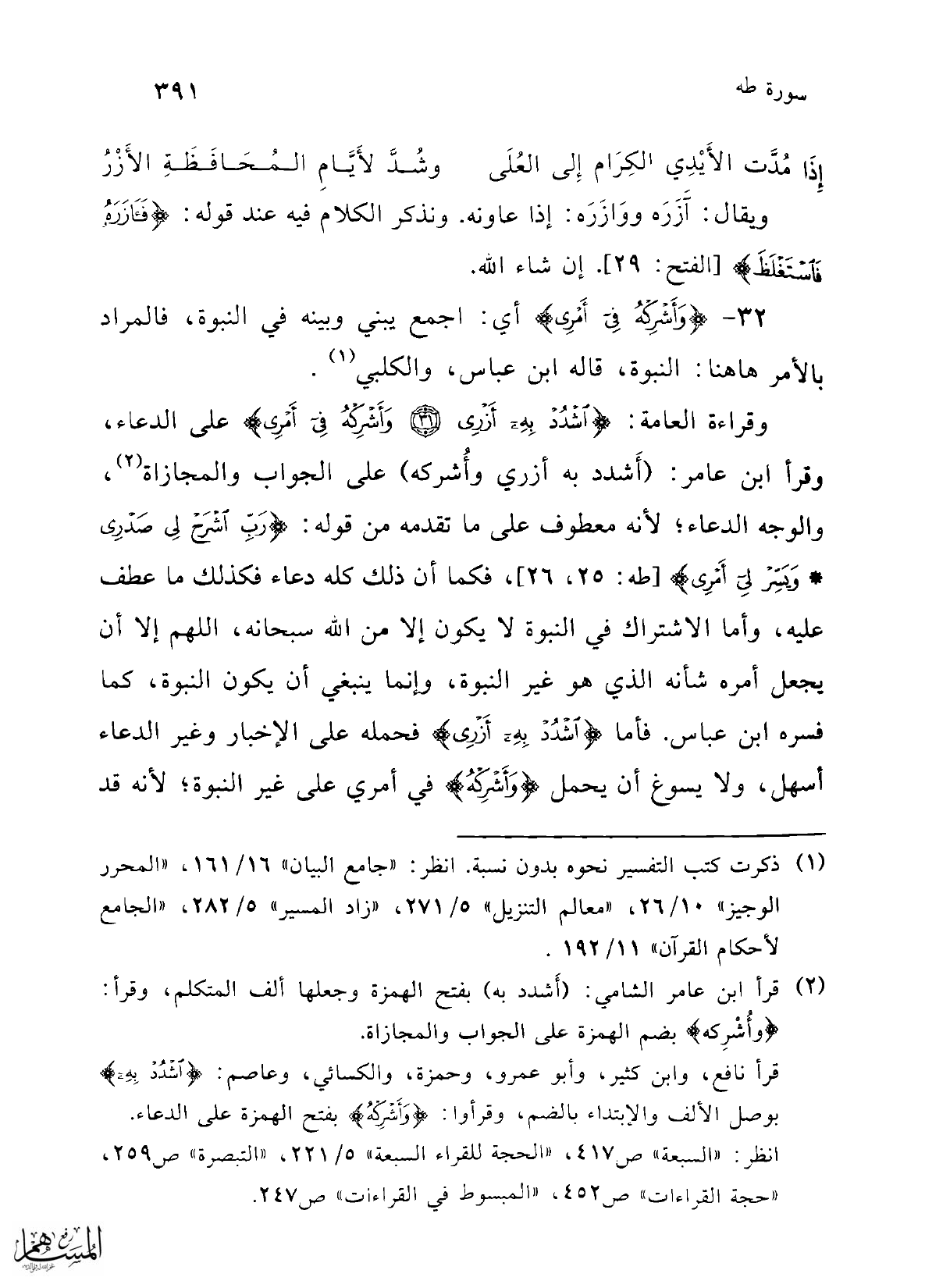 (¬2) قرأ ابن عامر الشامي: (أَشدد به) بفتح الهمزة وجعلها ألف المتكلم، وقرأ: {وَأَشْرِكْه} بضم الهمزة على الجواب والمجازاة.