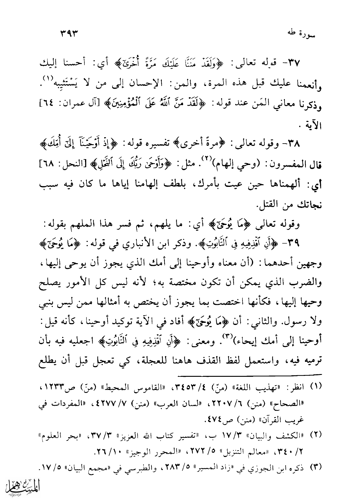 38 - وقوله تعالى: {مَرَّةً أُخْرَى} تفسيره قوله: {إِذْ أَوْحَيْنَا إِلَى أُمِّكَ} قال المفسرون: (وحي إلهام) (¬2). مثل: {وَأَوْحَى رَبُّكَ إِلَى النَّحْلِ} [النحل: 68] أي: ألهمناها حين عيت بأمرك، بلطف إلهامنا إياها ما كان فيه سبب نجاتك من القتل.