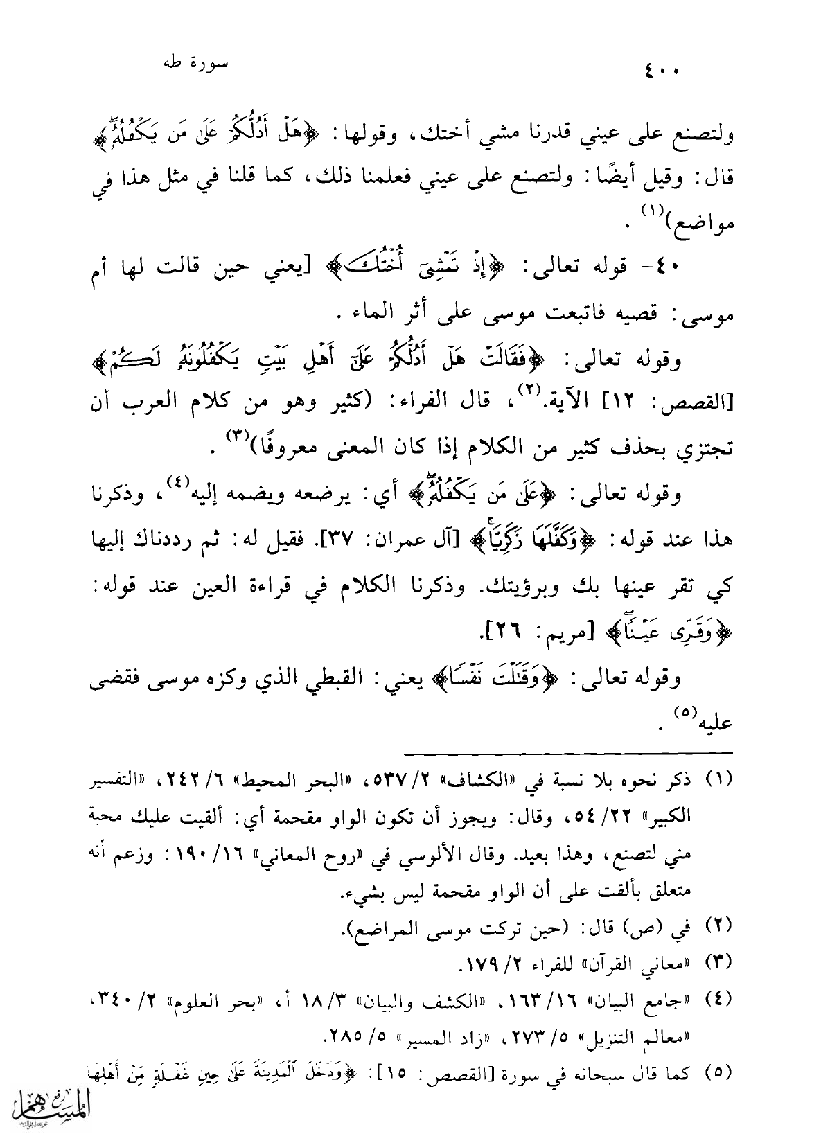وقوله تعالى: {عَلَى مَنْ يَكْفُلُهُ} أي: يرضعه ويضمه إليه (¬4)، وذكرنا هذا عند قوله: {وَكَفَّلَهَا زَكَرِيَّا} [آل عمران: 37]. فقيل له: ثم رددناك إليها كي تقر عينها بك وبرؤيتك. وذكرنا الكلام في قراءة العين عند قوله: {وَقَرِّي عَيْنًا} [مريم: 26].