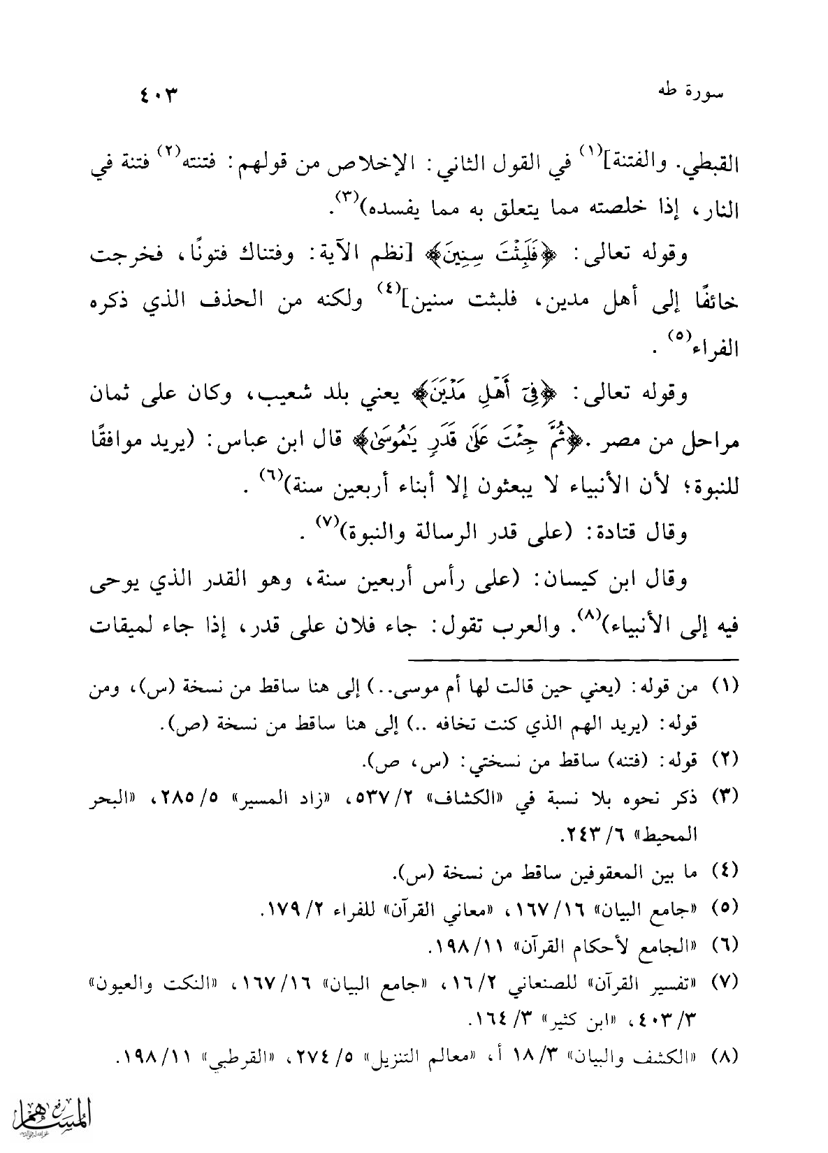 وقوله تعالى: {فَلَبِثْتَ سِنِينَ} [نظم الآية: وفتناك فتونًا، فخرجت خائفًا إلى أهل مدين، فلبثت سنين] (¬4) ولكنه من الحذف الذي ذكره الفراء (¬5).