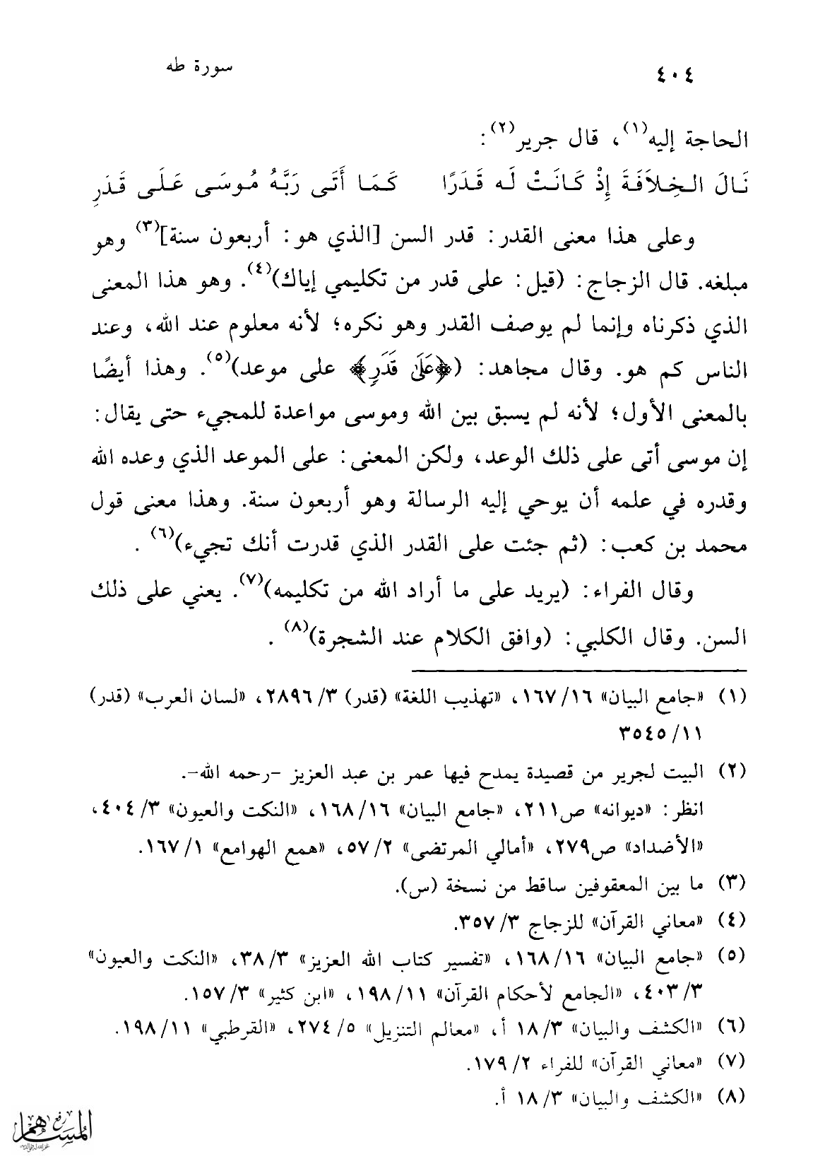 وقال الفراء: (يريد على ما أراد الله من تكليمه) (¬7). يعنىِ على ذلك السن. وقال الكلبي: (وافق الكلام عند الشجرة) (¬8).
