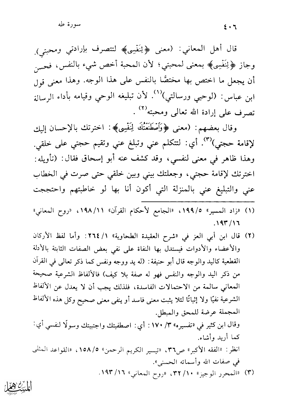 وقال بعضهم: (معنى {وَاصْطَنَعْتُكَ لِنَفْسِي}: اخترتك بالإحسان إليك لإقامة حجتي) (¬3). أي: لتتكلم عني وتبلغ عني وتقيم حجتي على خلفي. وهذا ظاهر في معنى لنفسي، وقد كشف عنه أبو إسحاق فقال: (تأويله: اخترتك لإقامة حجتي، وجعلتك بيني وبين خلقي حتى صرت في الخطاب عني والتبليغ عني بالمنزلة التي أكون أنا بها لو خاطبتهم واحتججت