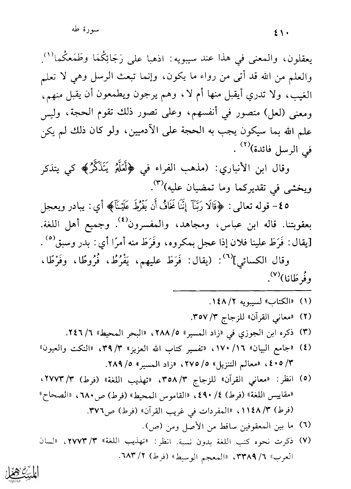 (¬5) انظر: "معاني القرآن" للزجاج 3/ 358، "تهذيب اللغة" (فرط) 3/ 2773, "مقاييس اللغة" (فرط) 4/ 490، "القاموس المحيط" (فرط) ص 680، "الصحاح" (فرط) 3/ 1148، "المفردات في غريب القرآن" (فرط) ص 376.