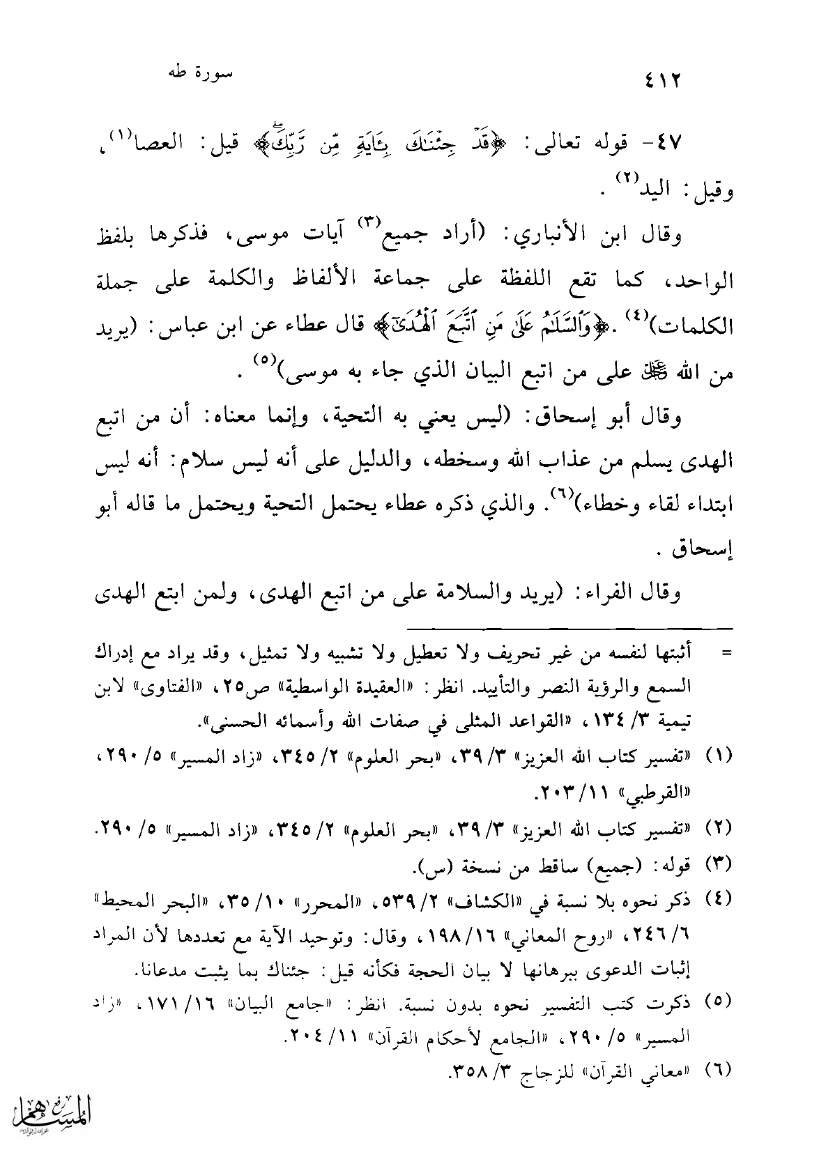 وقال ابن الأنباري: (أراد جميع (¬3) آيات موسى، فذكرها بلفظ الواحد، كما تقع اللفظة على جماعة الألفاظ والكلمة على جملة الكلمات) (¬4). {وَالسَّلَامُ عَلَى مَنِ اتَّبَعَ الْهُدَى} قال عطاء عن ابن عباس: (يريد من الله عز وجل على من اتبع البيان الذي جاء به موسى) (¬5).
