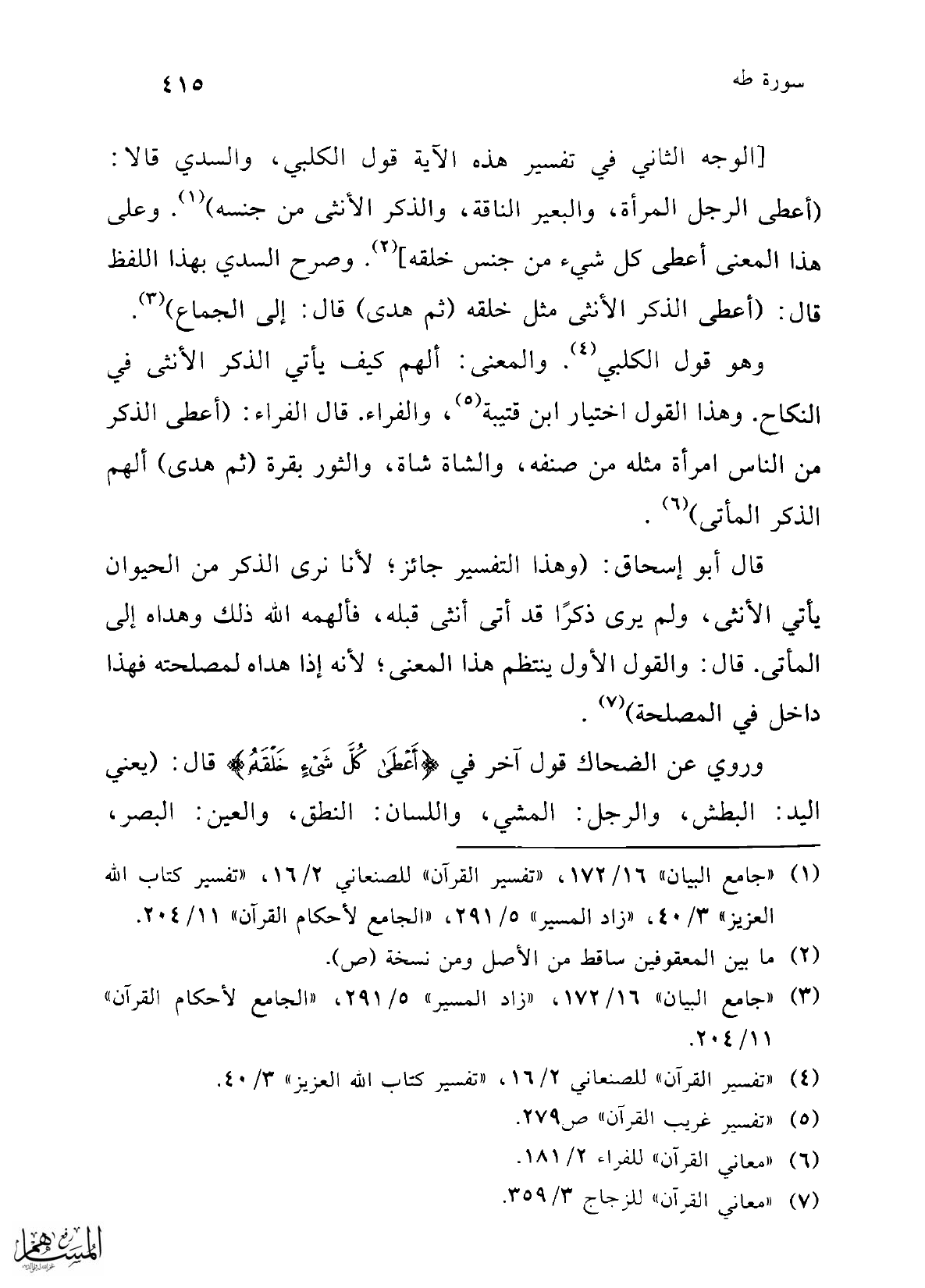 قال أبو إسحاق: (وهذا التفسير جائز؛ لأنا نرى الذكر من الحيوان يأتي الأنثى، ولم يرى ذكرًا قد أتى أنثى قبله، فألهمه الله ذلك وهداه إلى المأتى. قال: والقول الأول ينتظم هذا المعنى؛ لأنه إذا هداه لمصلحته فهذا داخل في المصلحة) (¬7).