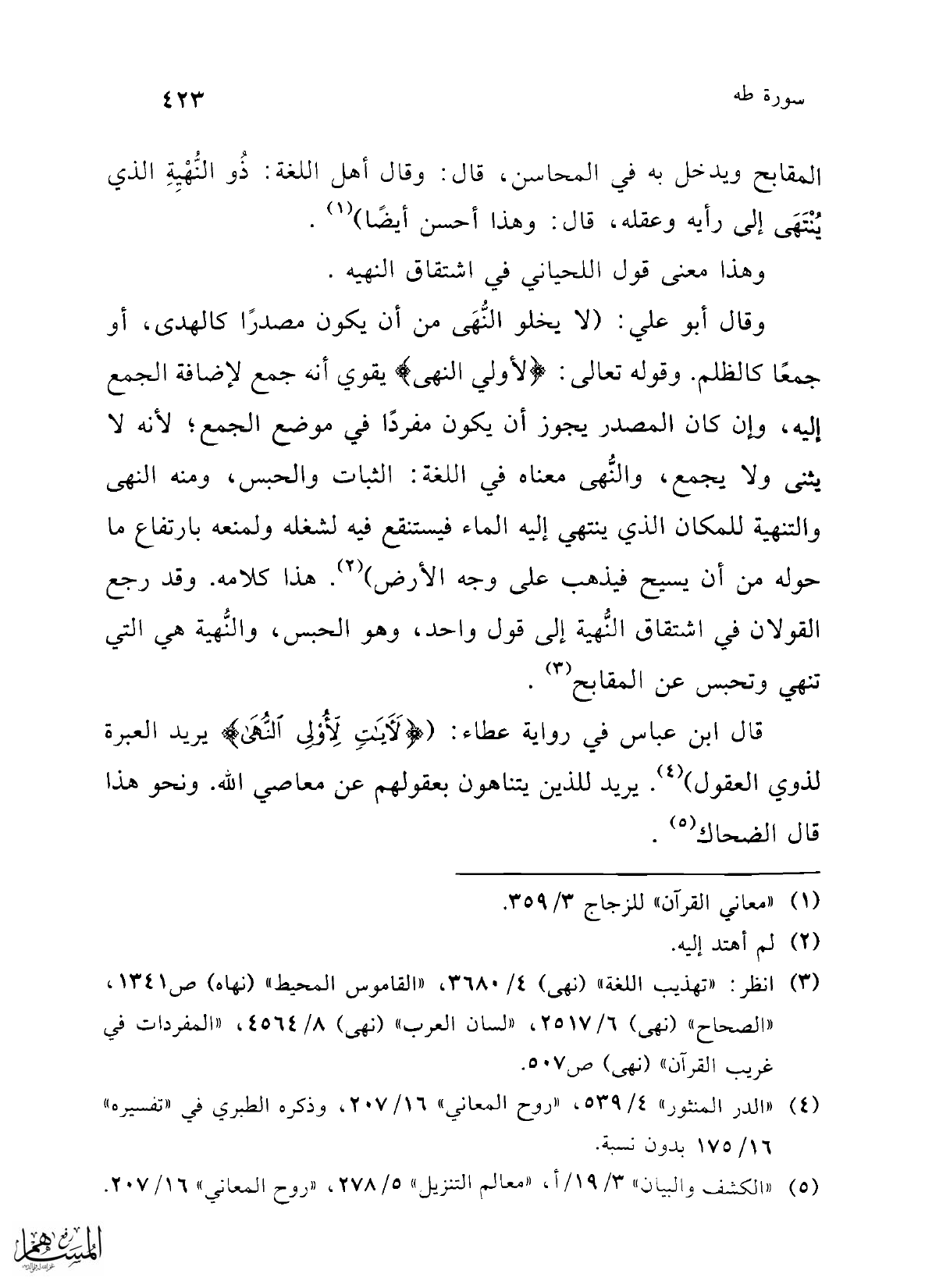 وقال أبو علي: (لا يخلو النُّهَى من أن يكون مصدرًا كالهدى، أو جمعًا كالظلم. وقوله تعالى: {لِأُولِي النُّهَى} يقوي أنه جمع لإضافة الجمع إليه، وإن كان المصدر يجوز أن يكون مفردًا في موضع الجمع؛ لأنه لا يثنى ولا يجمع، والنُّهى معناه في اللغة: الثبات والحبس، ومنه النهى والتنهية للمكان الذي ينتهي إليه الماء فيستنقع فيه لشغله ولمنعه بارتفاع ما حوله من أن يسيح فيذهب على وجه الأرض) (¬2). هذا كلامه. وقد رجع القولان في اشتقاق النُّهية إلى قول واحد، وهو الحبس، والنُّهية هي التي تنهي وتحبس عن المقابح (¬3).