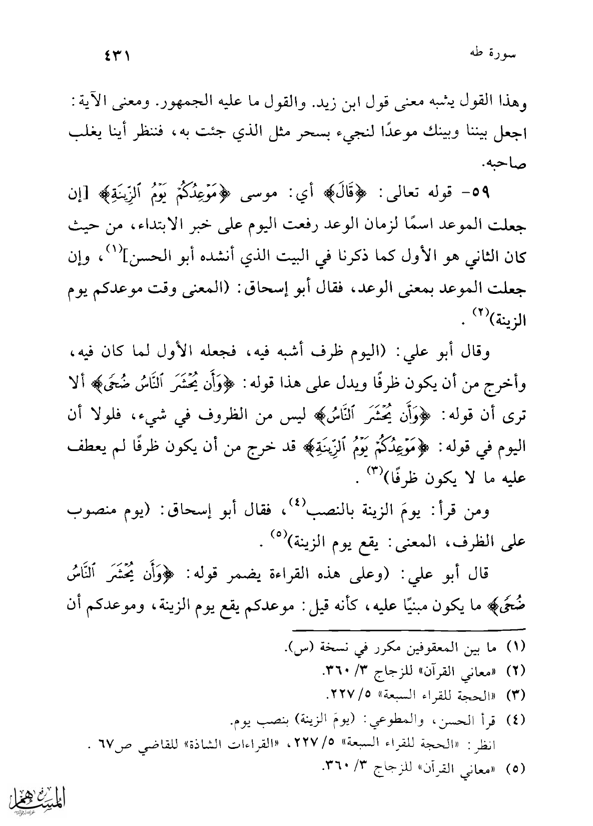 59 - قوله تعالى: {قَالَ} أي: موسى: {مَوْعِدُكُمْ يَوْمُ الزِّينَةِ} [إن جعلت الموعد اسمًا لزمان الوعد رفعت اليوم على خبر الابتداء، من حيث كان الثاني هو الأوّل كما ذكرنا في البيت الذي أنشده أبو الحسن] (¬1)، وإن جعلت الموعد بمعنى الوعد، فقال أبو إسحاق: (المعنى وقت موعدكم يوم الزينة) (¬2).