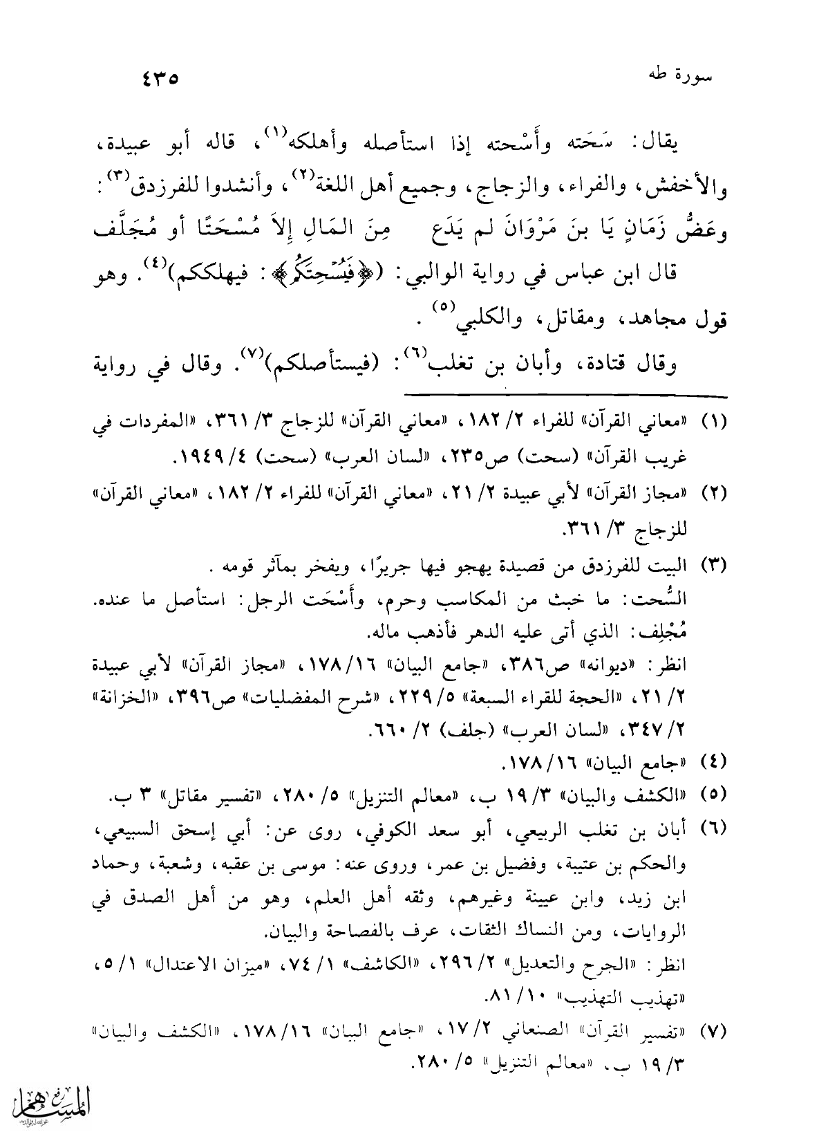 (¬1) "معاني القرآن" للفراء 2/ 182، "معاني القرآن" للزجاج 3/ 361، "المفردات في غريب القرآن" (سحت) ص 235، "لسان العرب" (سحت) 4/ 1949.