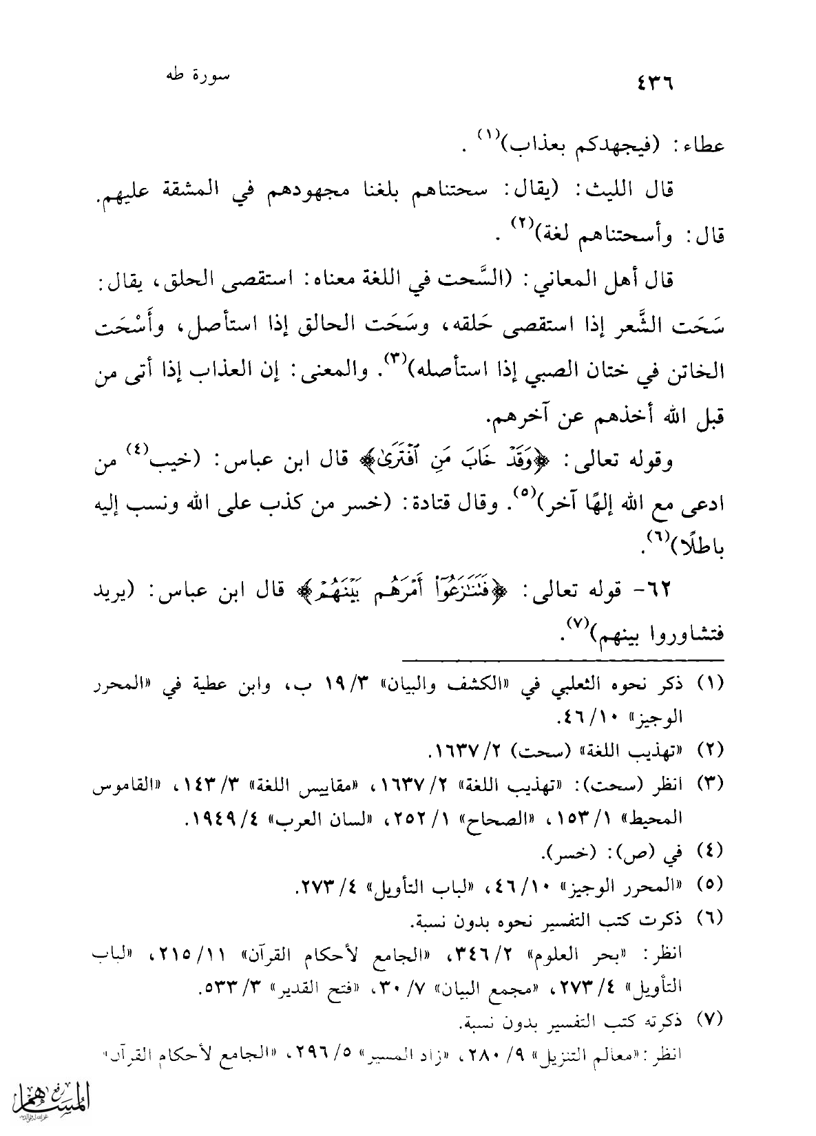 قال أهل المعاني: (السَّحت في اللغة معناه: استقصى الحلق، يقال: سَحَت الشَّعر إذا استقصى حَلقه، وسَحَت الحالق إذا استأصل، وأَسْحَت الخاتن في ختان الصبي إذا استأصله) (¬3). والمعنى: إن العذاب إذا أتى من قبل الله أخذهم عن آخرهم.