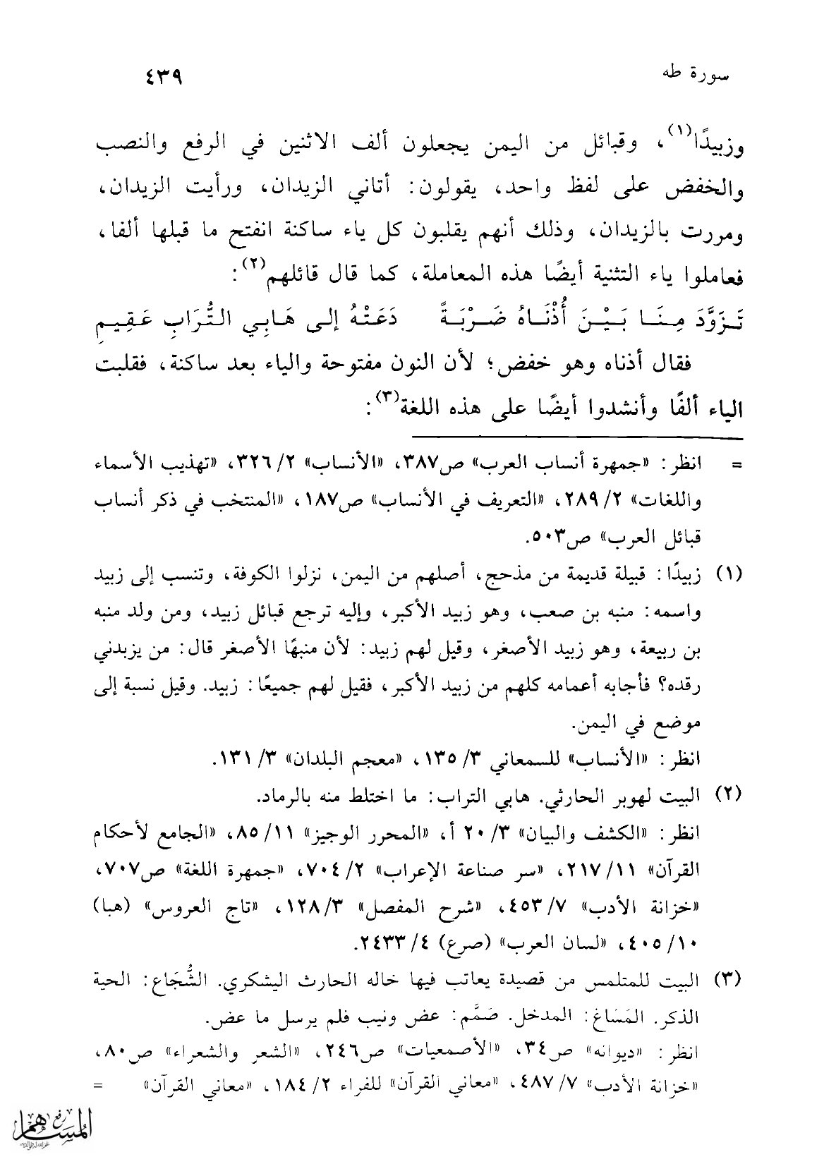 وزبيدًا (¬1)، وقبائل من اليمن يجعلون ألف الاثنين في الرفع والنصب والخفض على لفظ واحد، يقولون: أتاني الزيدان، ورأيت الزيدان، ومررت بالزيدان، وذلك أنهم يقلبون كل ياء ساكنة انفتح ما قبلها ألفا، فعاملوا ياء التثنية أيضًا هذه المعاملة، كما قال قائلهم (¬2):
