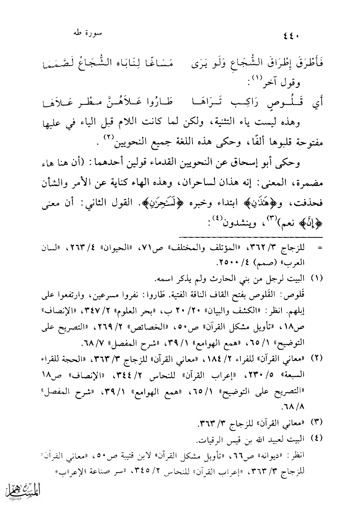 وحكى أبو إسحاق عن النحويين القدماء قولين أحدهما: (أن هنا هاء مضمرة، المعنى: إنه هذان لساحران، وهذه الهاء كناية عن الأمر والشأن فحذفت، و {هَذَانِ} ابتداء وخبره {لَسَاحِرَانِ}. القول الثاني: أن معنى {إِنْ} نعم) (¬3)، وينشدون (¬4):